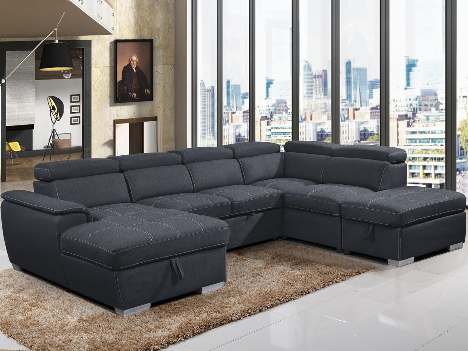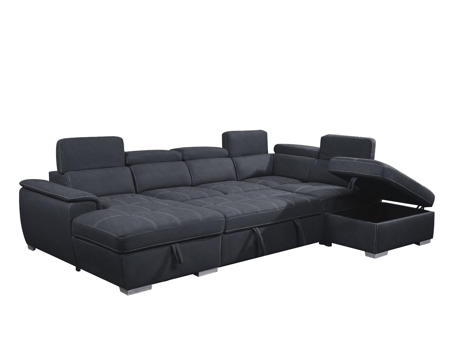 Introducing our stylish and functional lounge, perfect for any modern living space. Our lounge features a comfortable sofa bed, allowing you to easily accommodate overnight guests without sacrificing style or comfort. Our lounge also includes an ottoman with storage, providing a convenient spot to store extra blankets, pillows, or other items. The adjustable headrests add another layer of comfort, allowing you to customize the angle of your head and neck for optimal relaxation. Crafted with high-quality Cotton and linen material, our lounge is both durable and stylish. Our lounge also features a chaise on one side with storage, providing additional seating and storage space. The chaise can be used for lounging or as an extra sleeping area for guests.