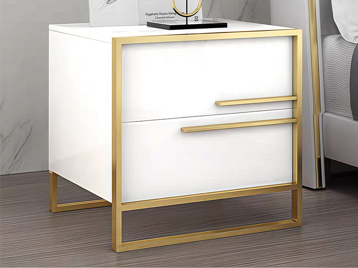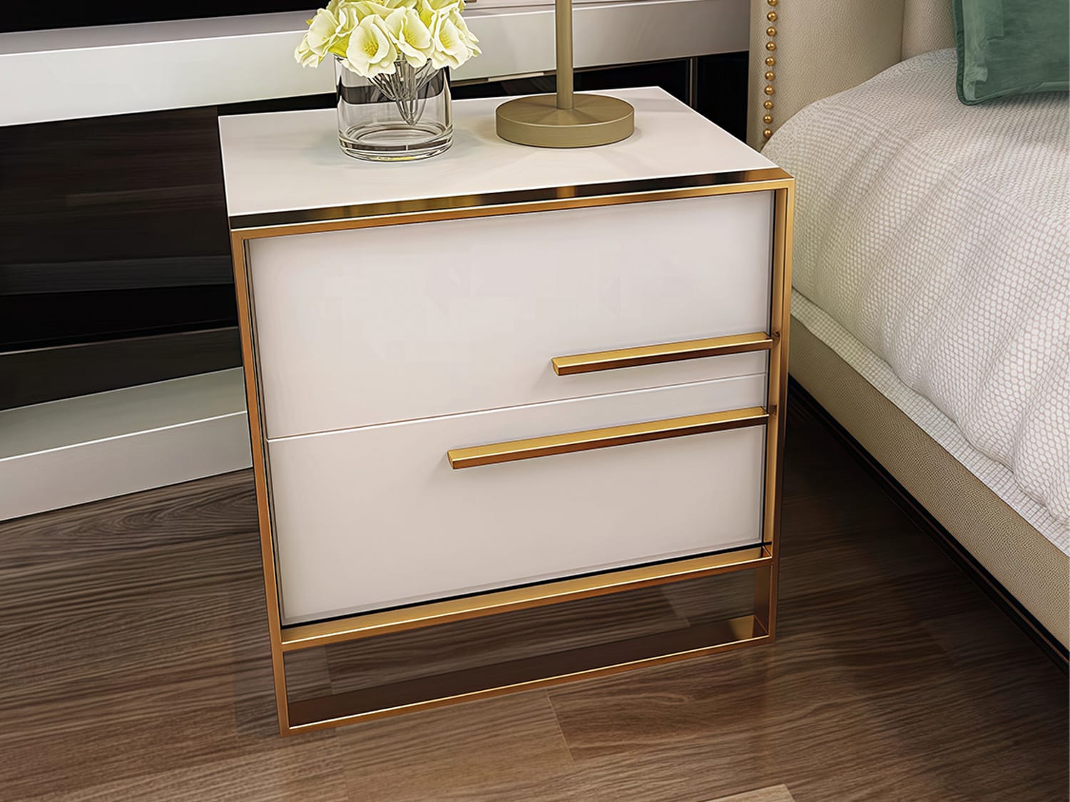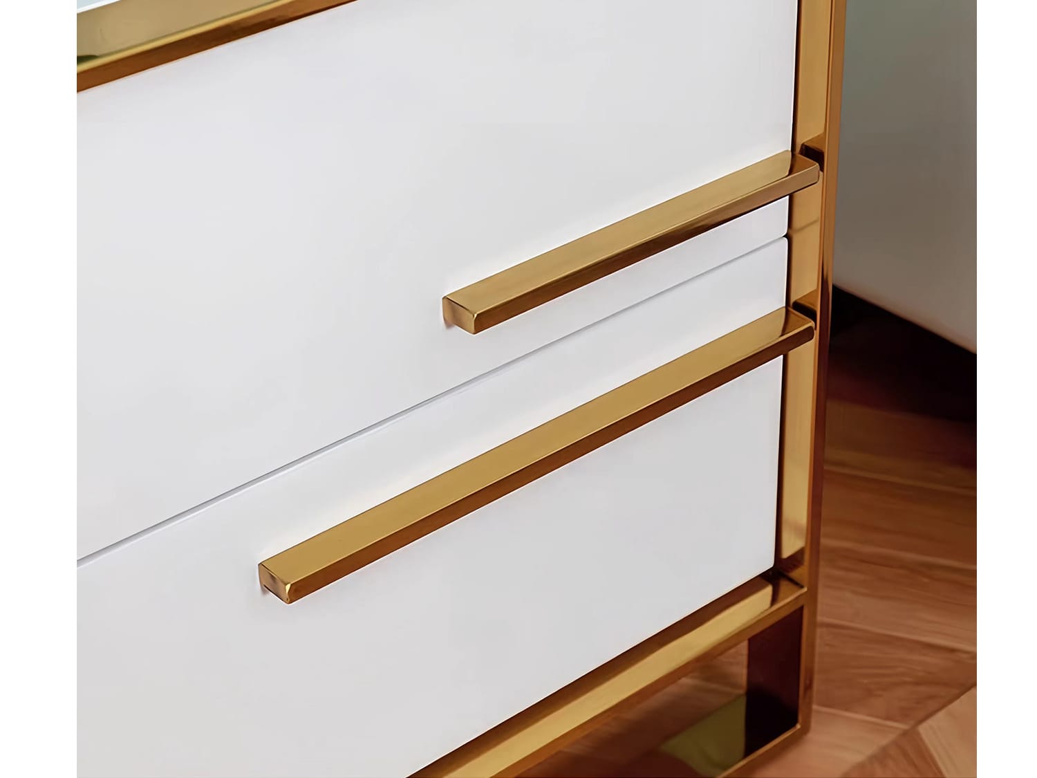 The Broden embodies modernity and elegance with minimalist designs and undeniable colors of luxury. Decorating its anterior is a gold-coloured stainless steel frame that outlines the two cabinets and highlights the minimalist handles on its borders. The drawers open up to reveal masterfully crafted drawers with the right amount of space to satisfy your curating needs. This minimalistic piece in white and gold is sure to give luxurious modernity to any space in your home.
