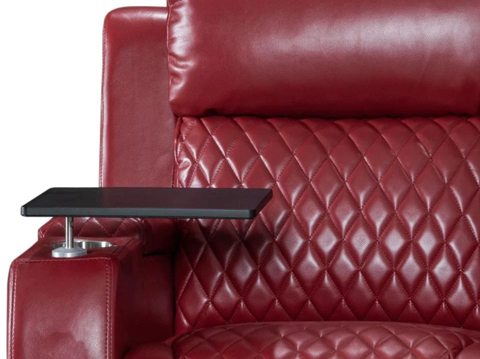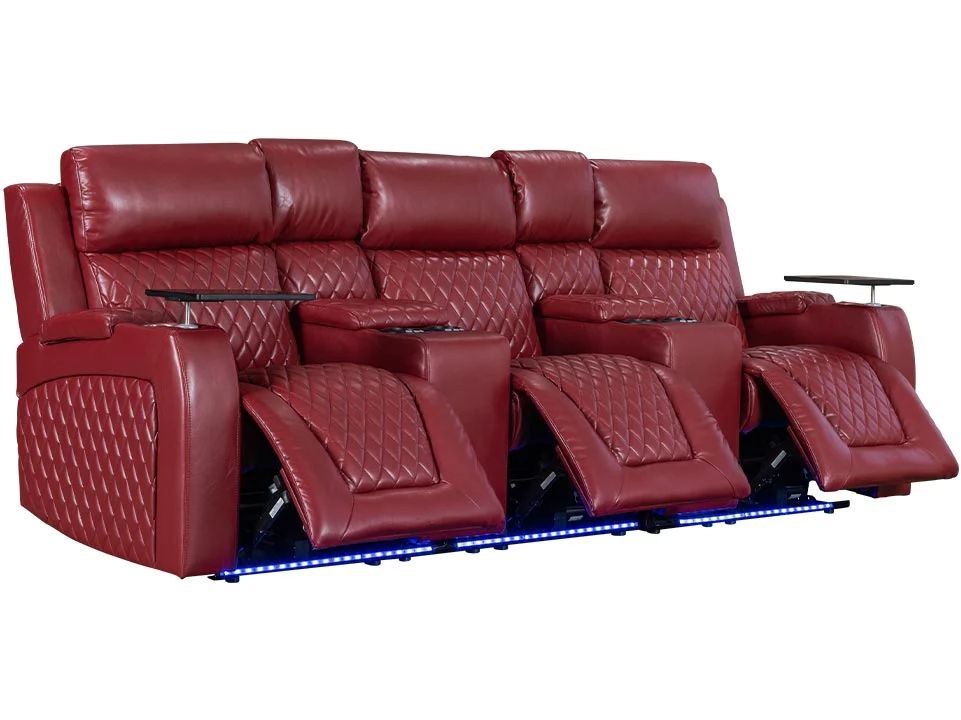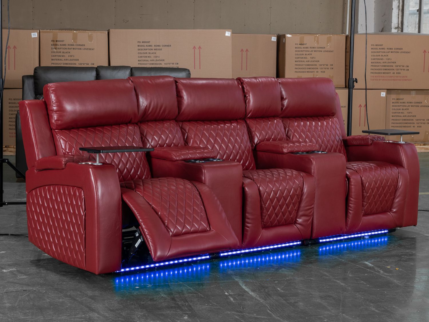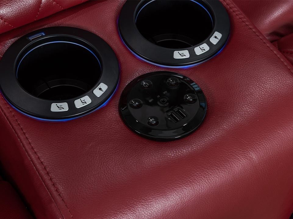 | Feature | 3 electric recliners Power motion with USB Ports Electric footrest Led light under seats Armrest storage Lighting Cupholders Tray tables |