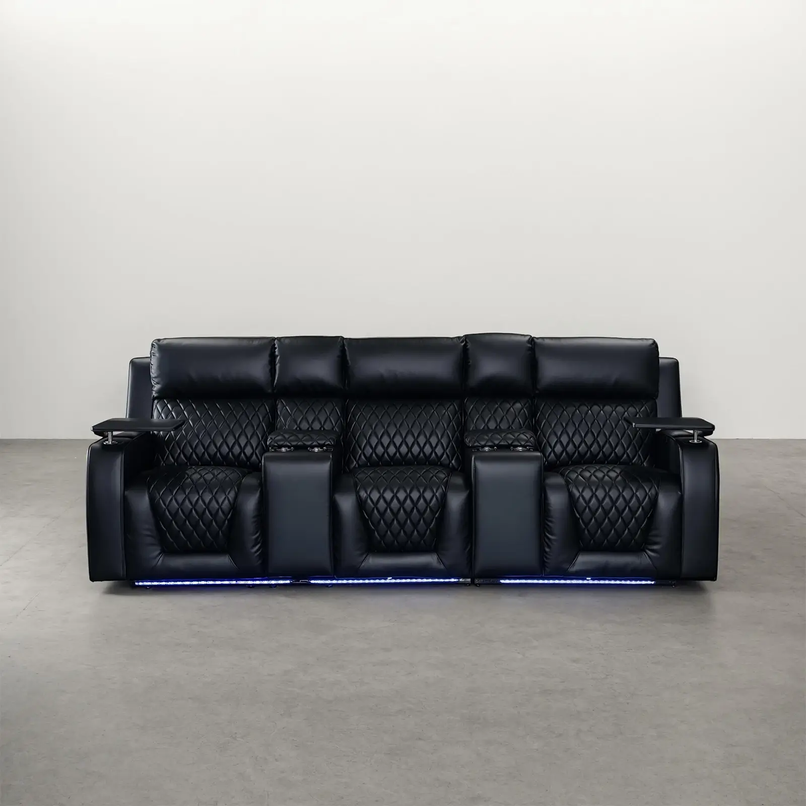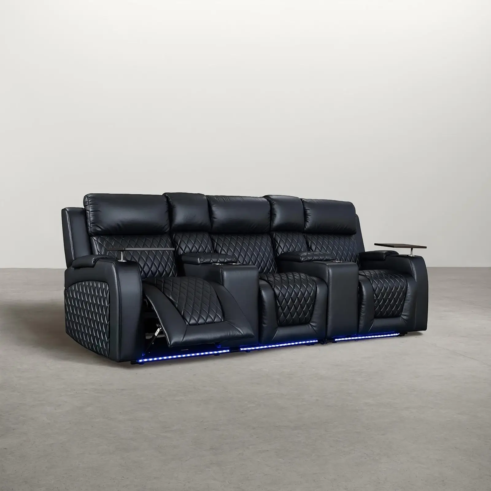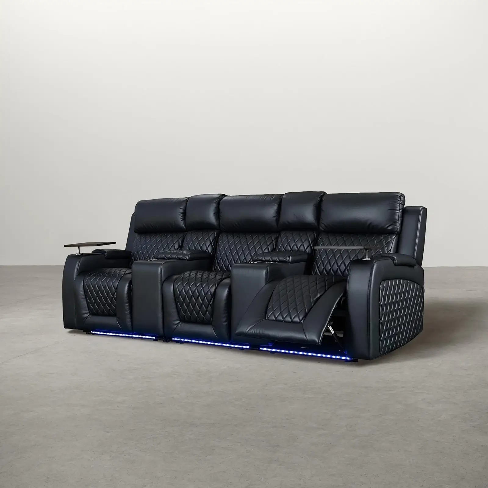| Feature | 3 electric recliners Power motion with USB Ports Electric footrest Led light under seats Armrest storage Lighting Cupholders Tray tables |