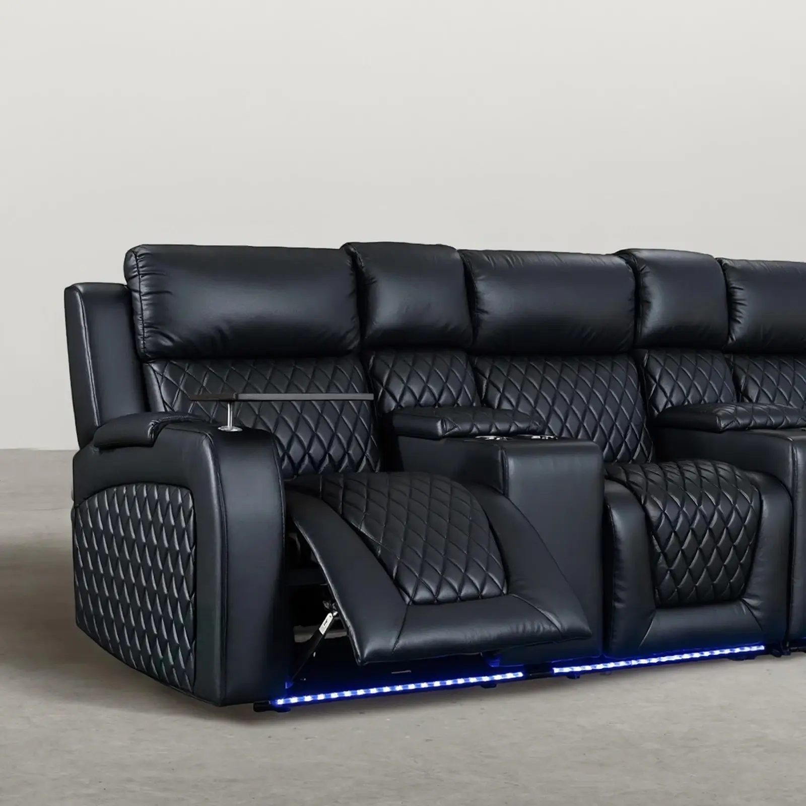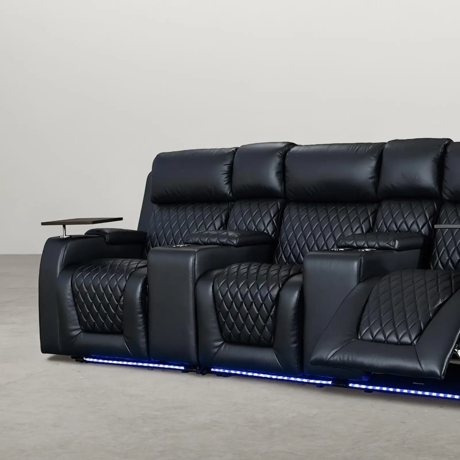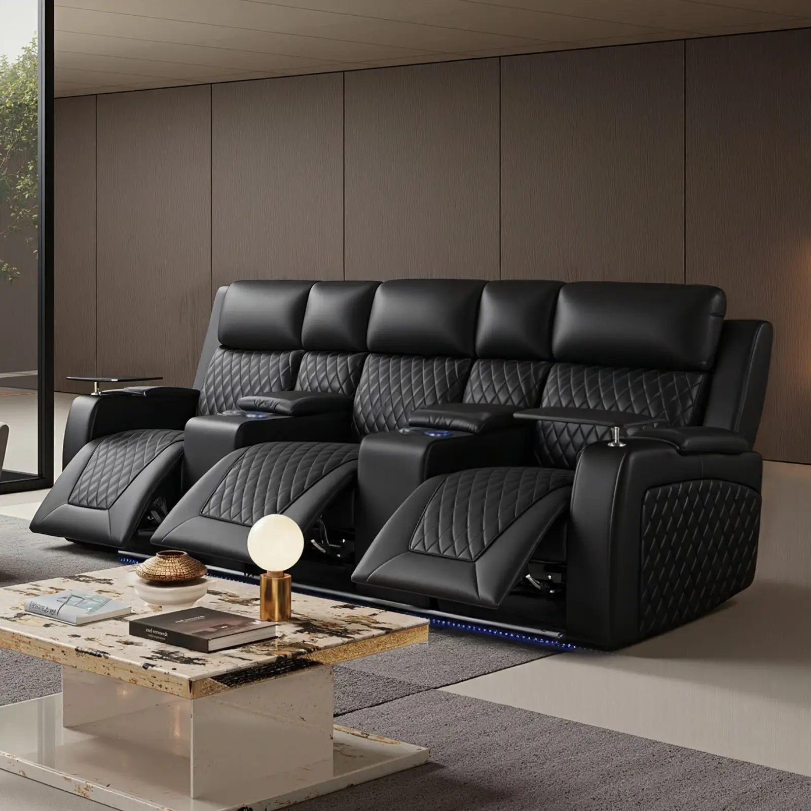| Feature | 3 electric recliners Power motion with USB Ports Electric footrest Led light under seats Armrest storage Lighting Cupholders Tray tables |