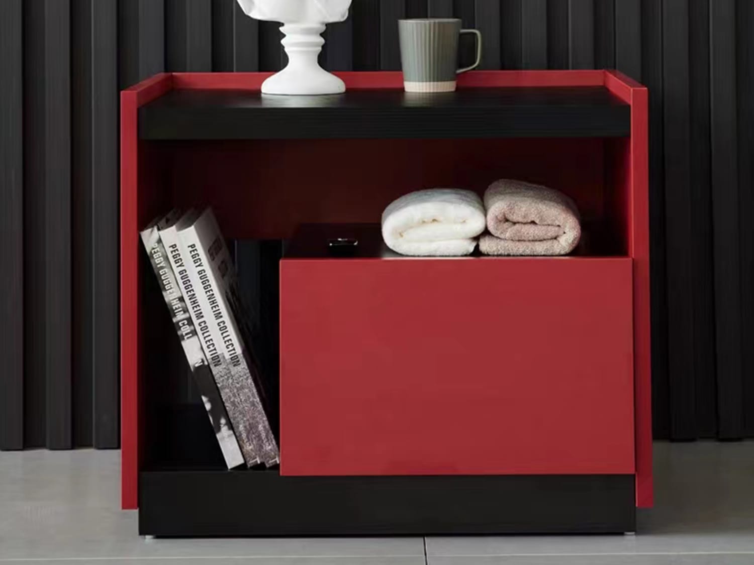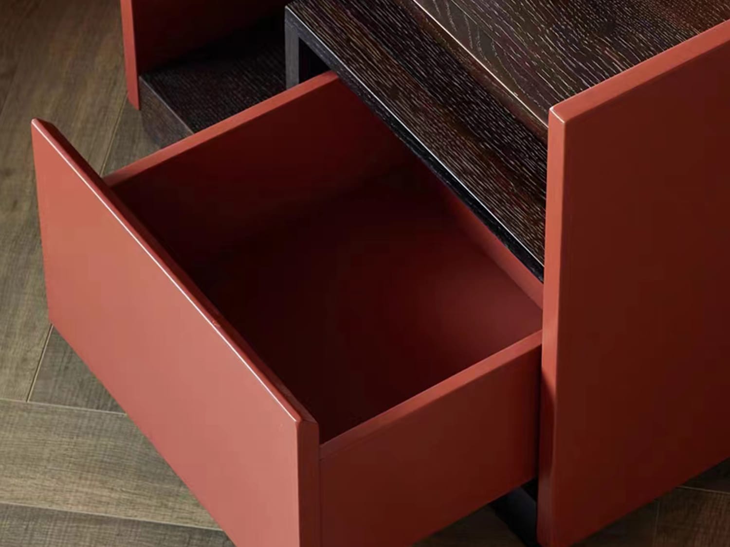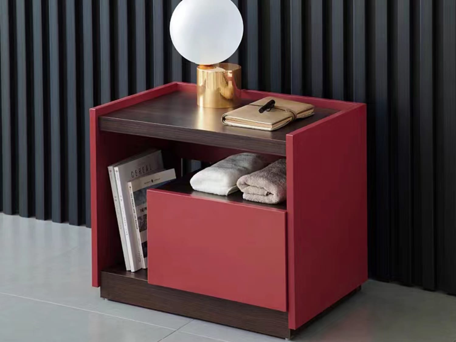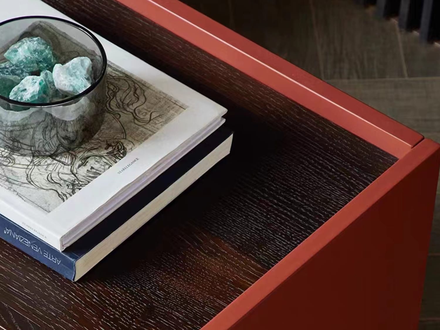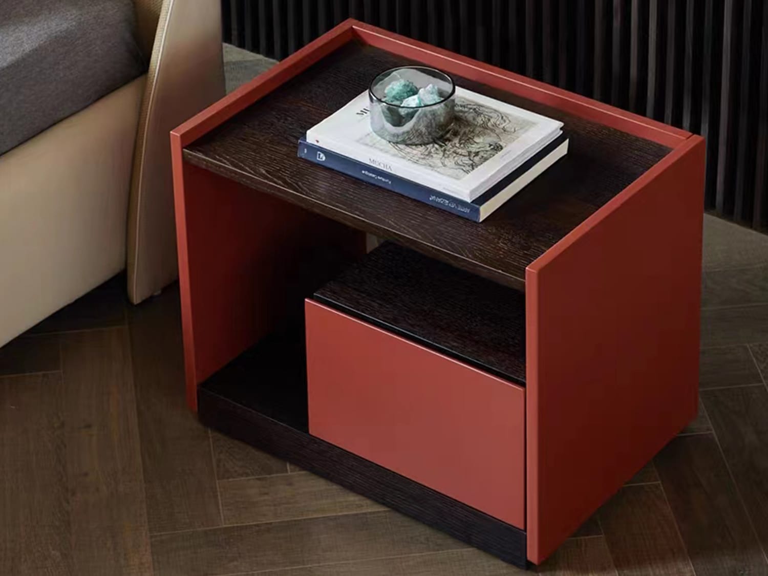 Forli Bedside Table is a beautiful piece of ash furniture with a one-drawer, smoked wood process, and red finish. This is available in three colors, including this one which depicts an elegant combination of wood and concrete.