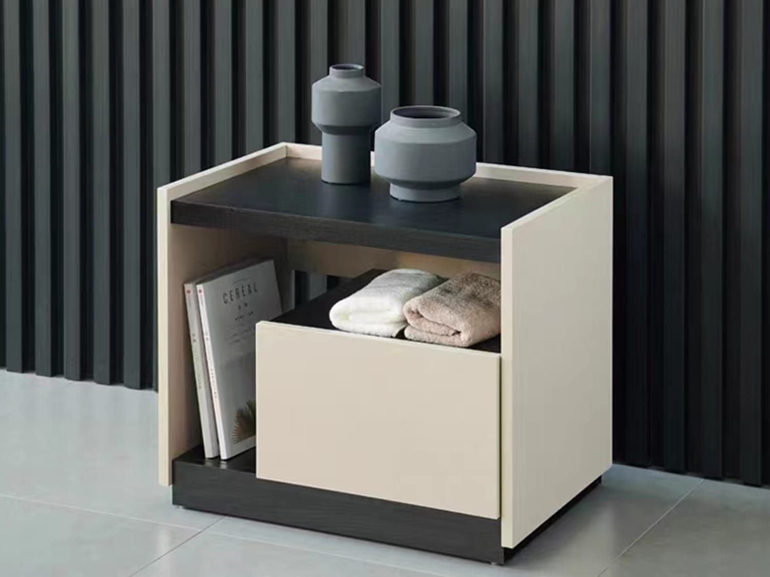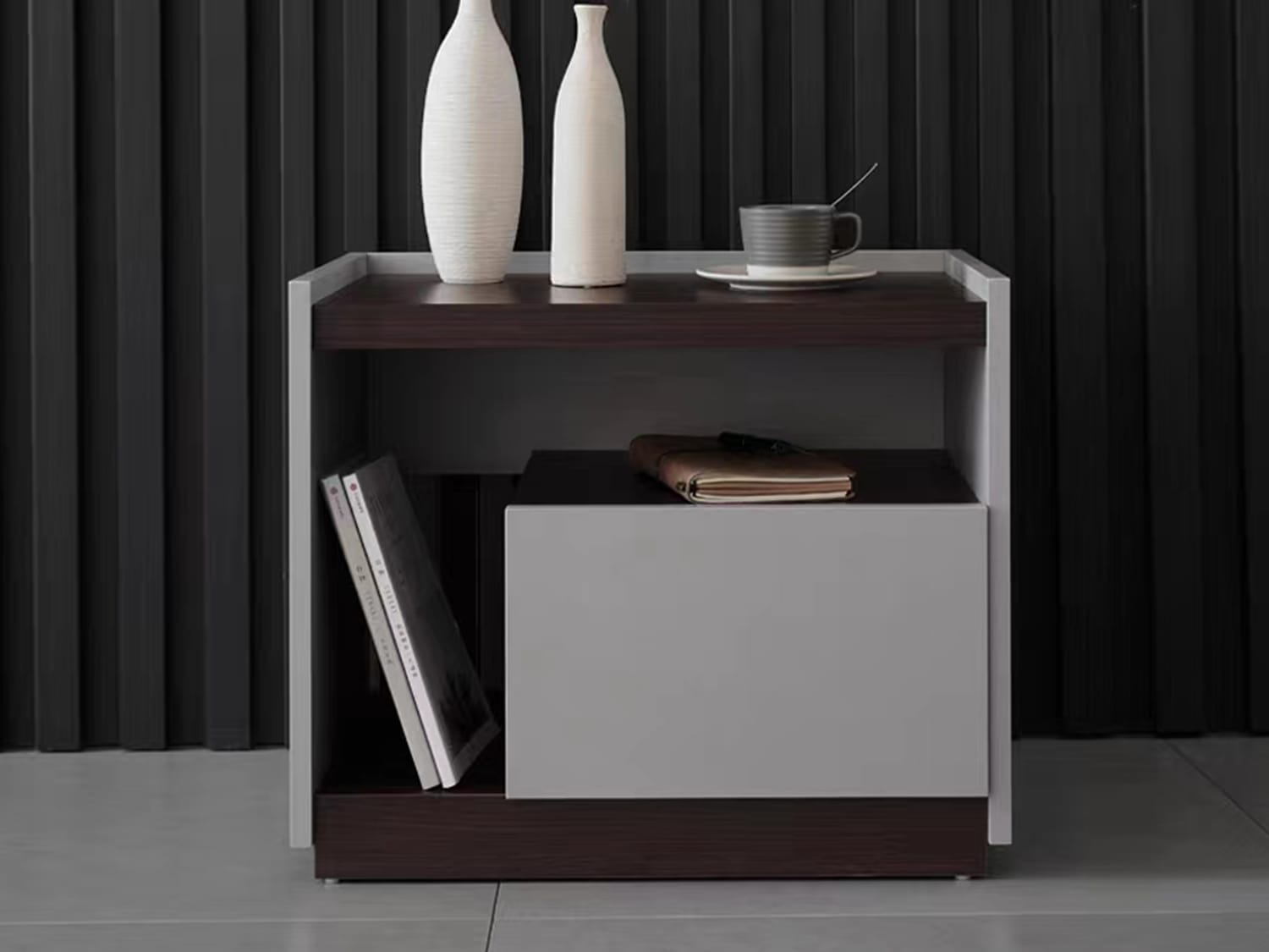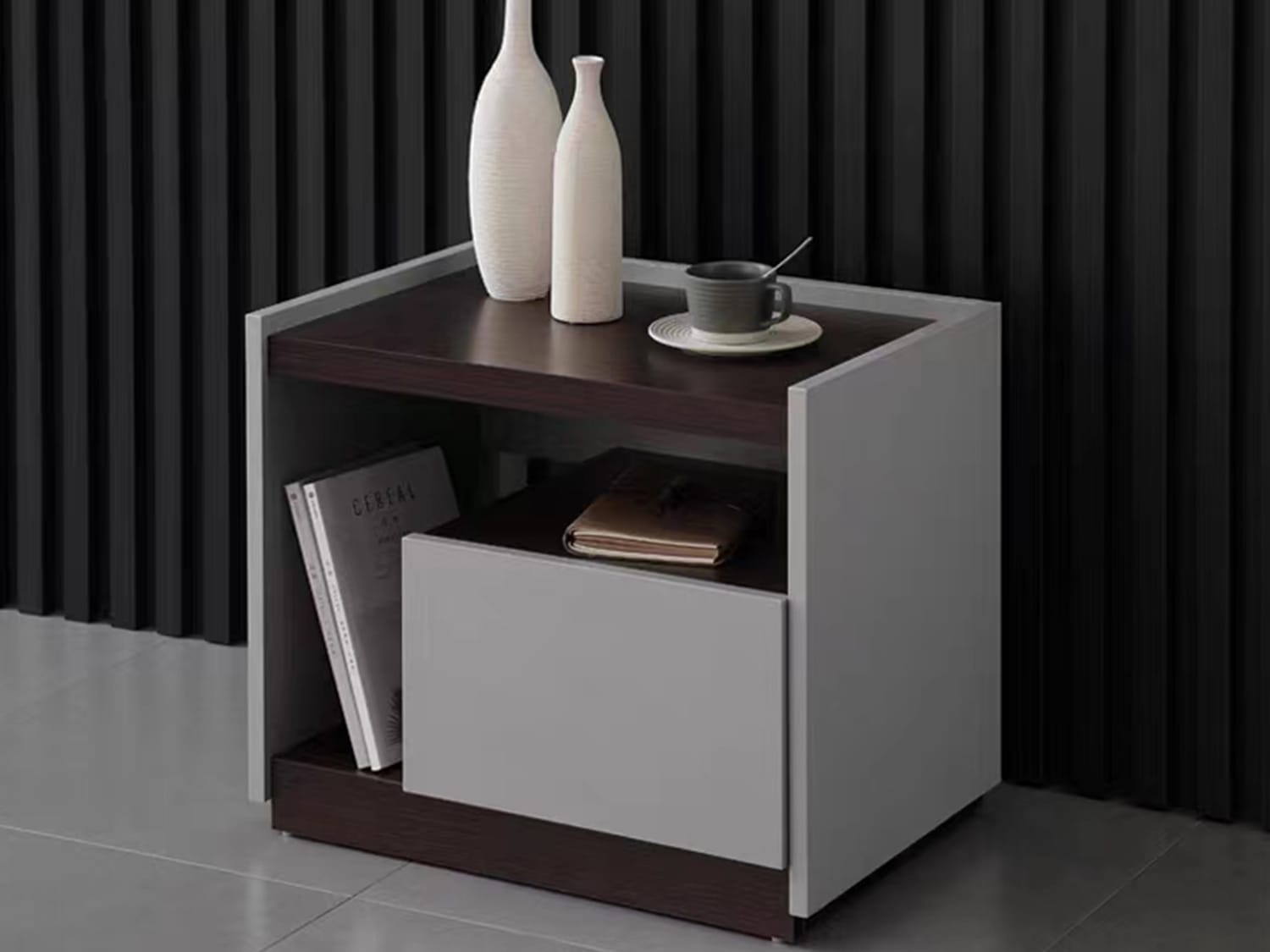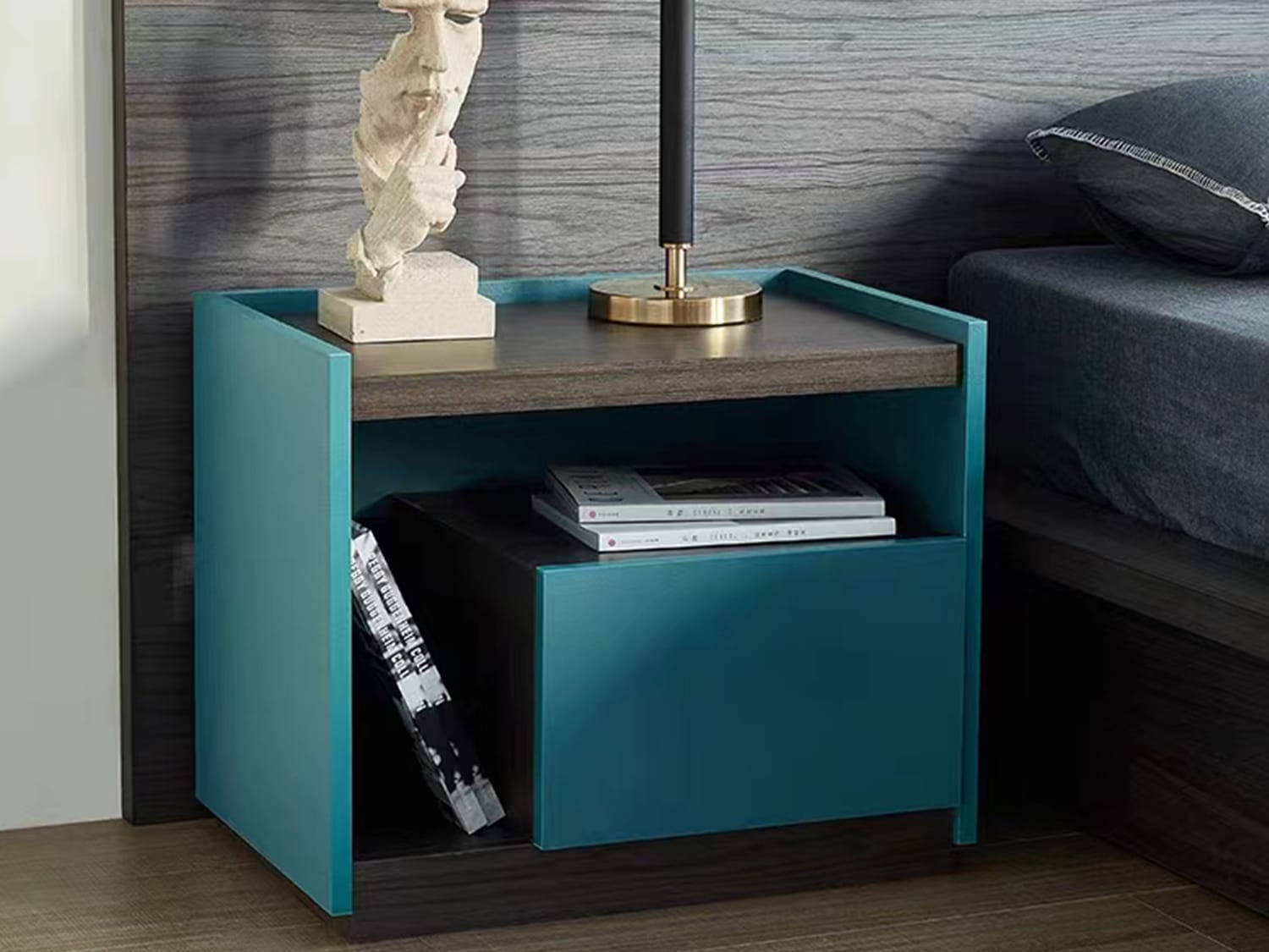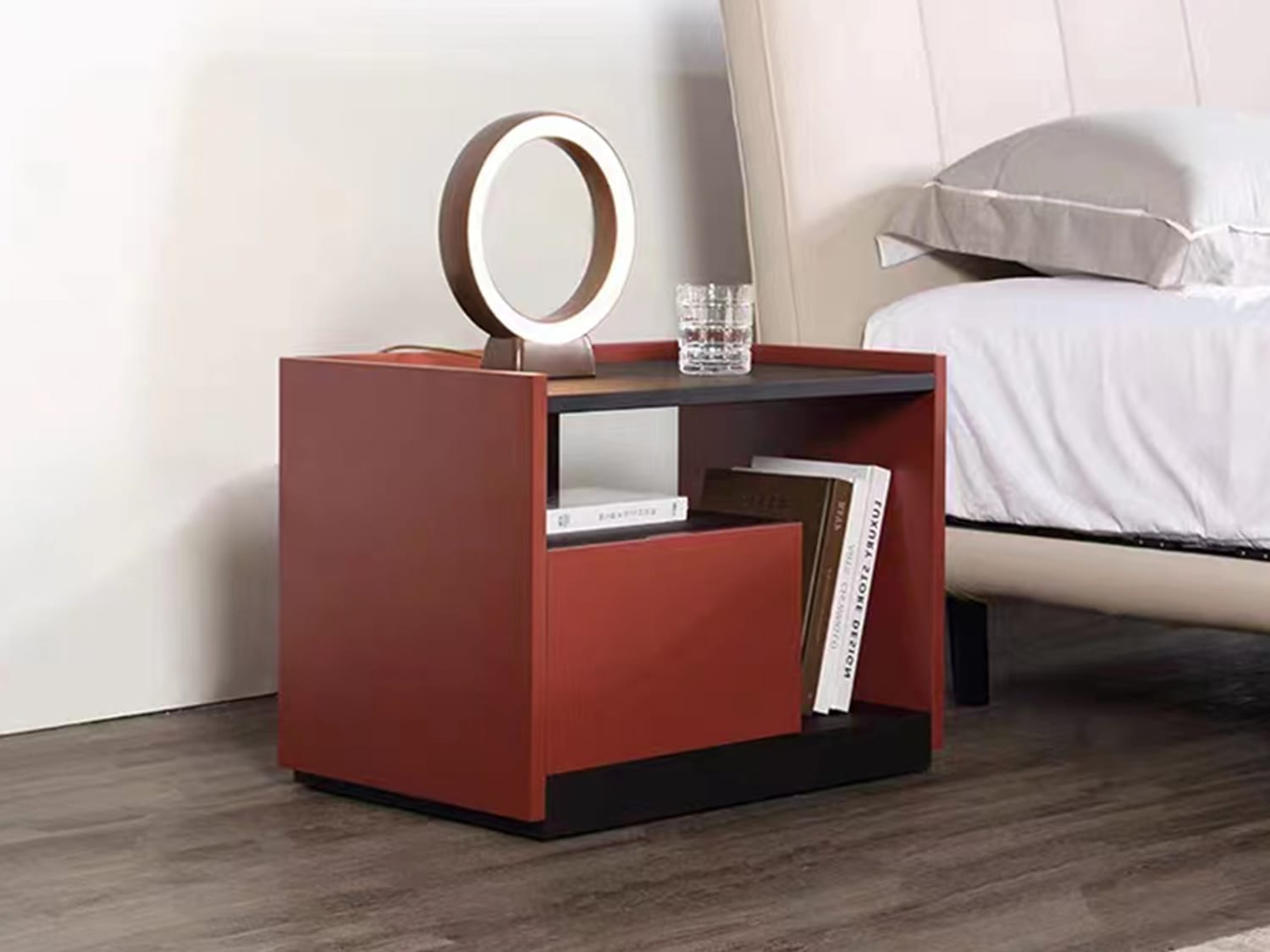 Forli Bedside Table is a beautiful piece of ash furniture with a one-drawer, smoked wood process, and red finish. This is available in three colors, including this one which depicts an elegant combination of wood and concrete.