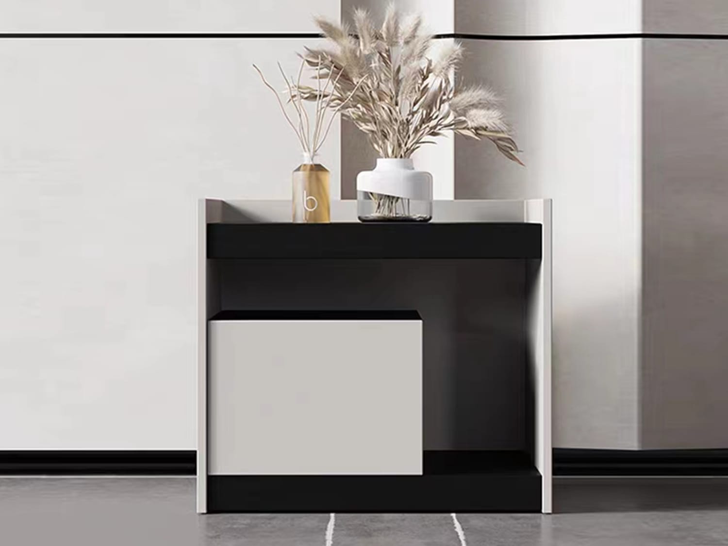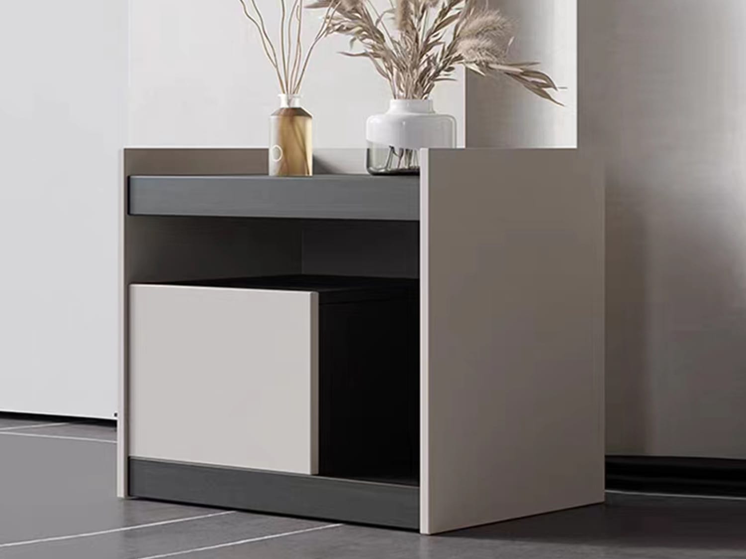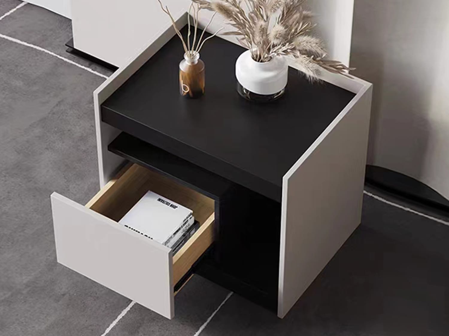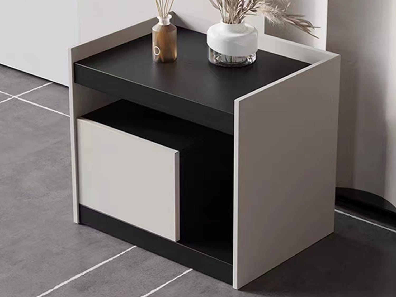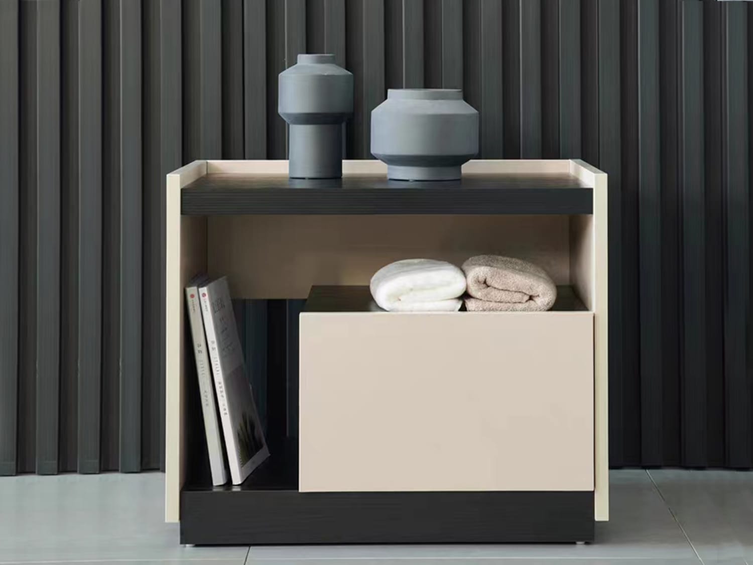 Forli Bedside Table is a beautiful piece of ash furniture with a one-drawer, smoked wood process, and red finish. This is available in three colors, including this one which depicts an elegant combination of wood and concrete.