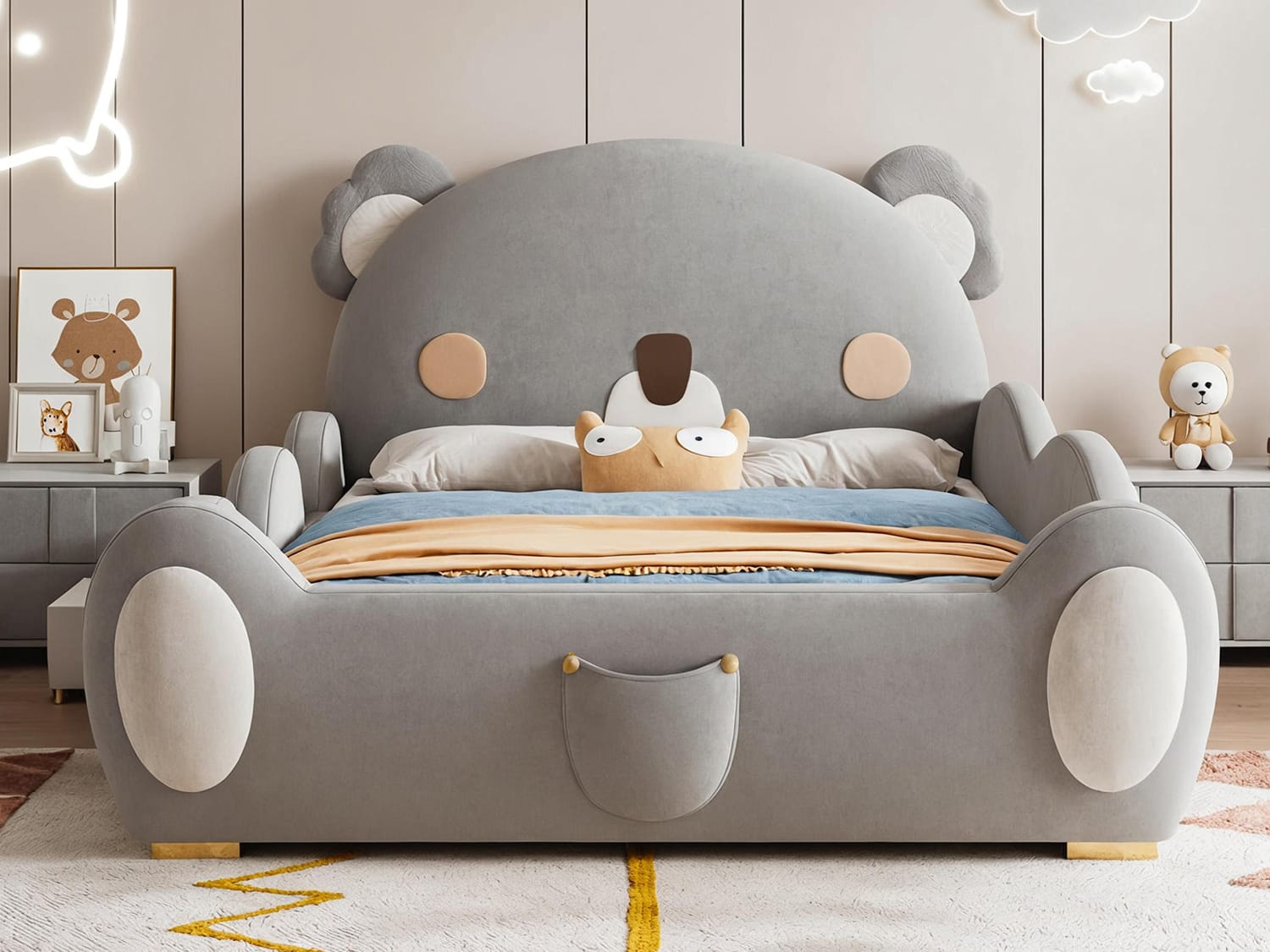 Upholstered in soft velvet suede with high-density foam padding, it ensures comfort, while rounded safety corners prevent bumps and bruises. The sturdy metal, solid wood and plywood construction guarantees durability for years of use.