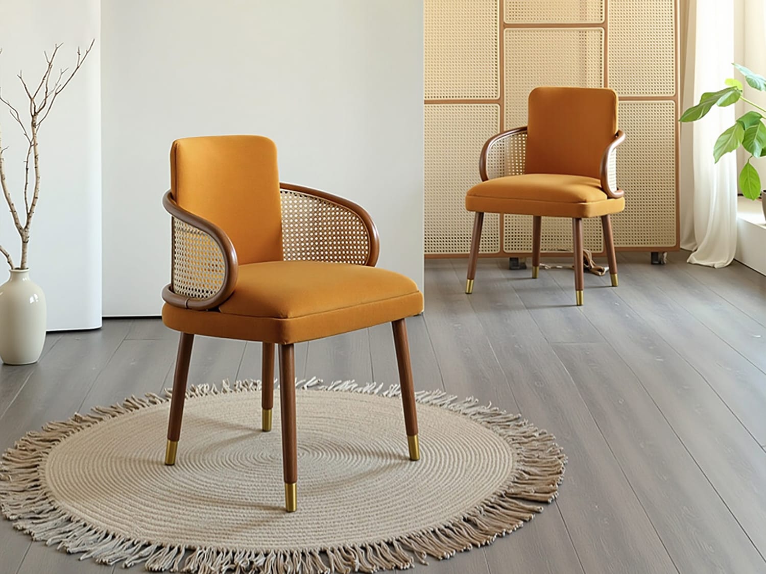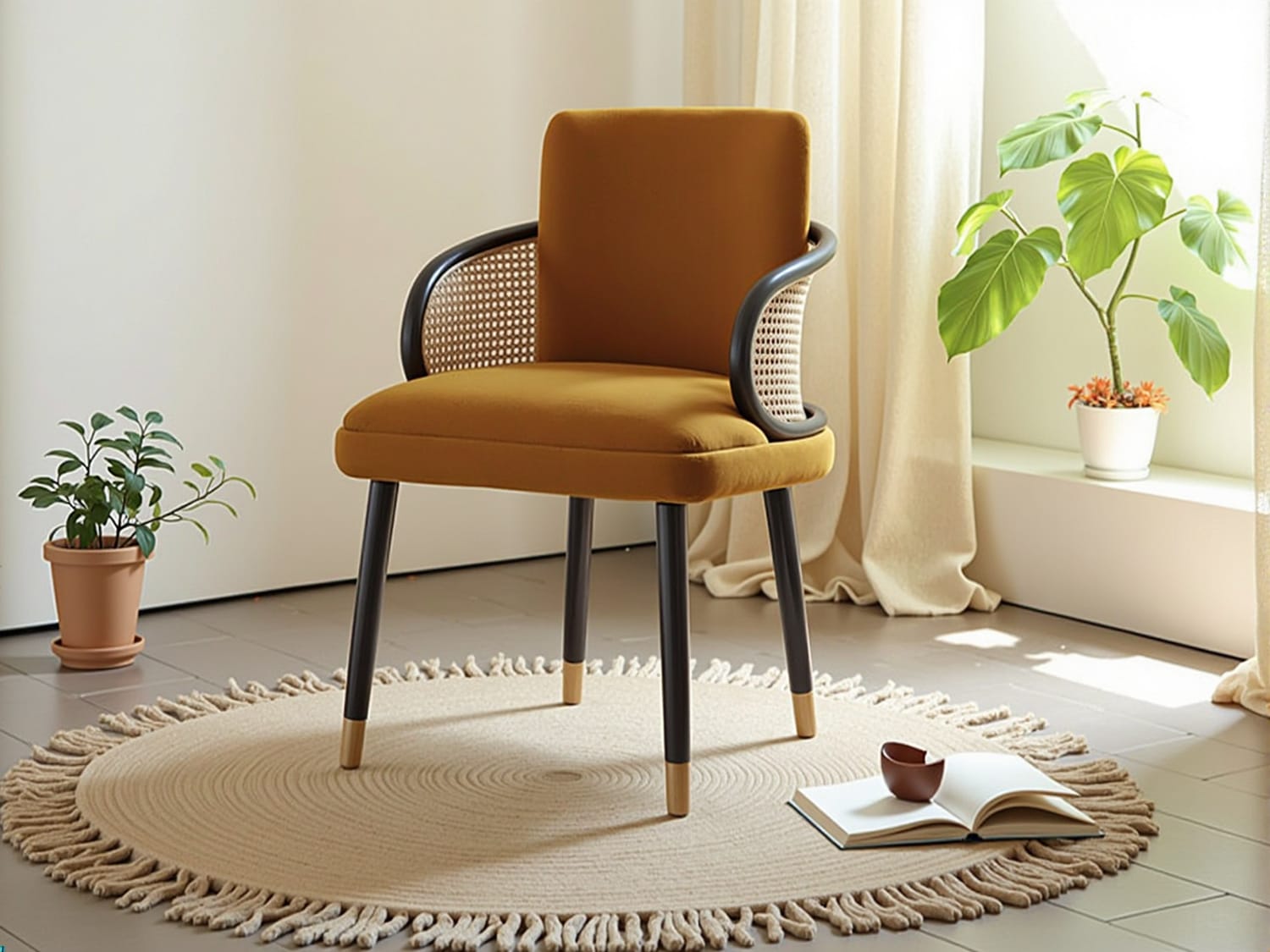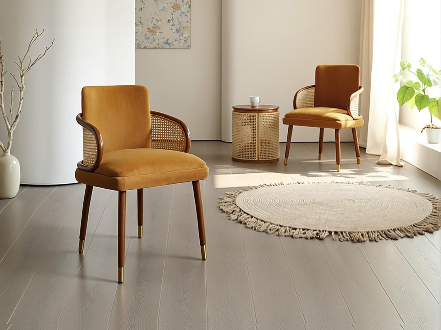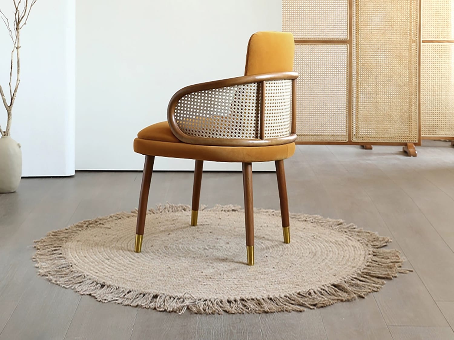 Elevate your dining experience with the Hepburn Modern Dining Chair, blending rich velvet suede upholstery with natural rattan accents in sophisticated Black, Off White and Ochre. The harmonious combination of plush fabric and woven texture creates visual depth, while the solid wood frame ensures lasting durability. Designed for both comfort and style, its gently curved backrest supports leisurely meals and lively conversations. This versatile piece transitions effortlessly from everyday family dinners to elegant entertaining, adding a touch of organic modernism to your carefully designed space.