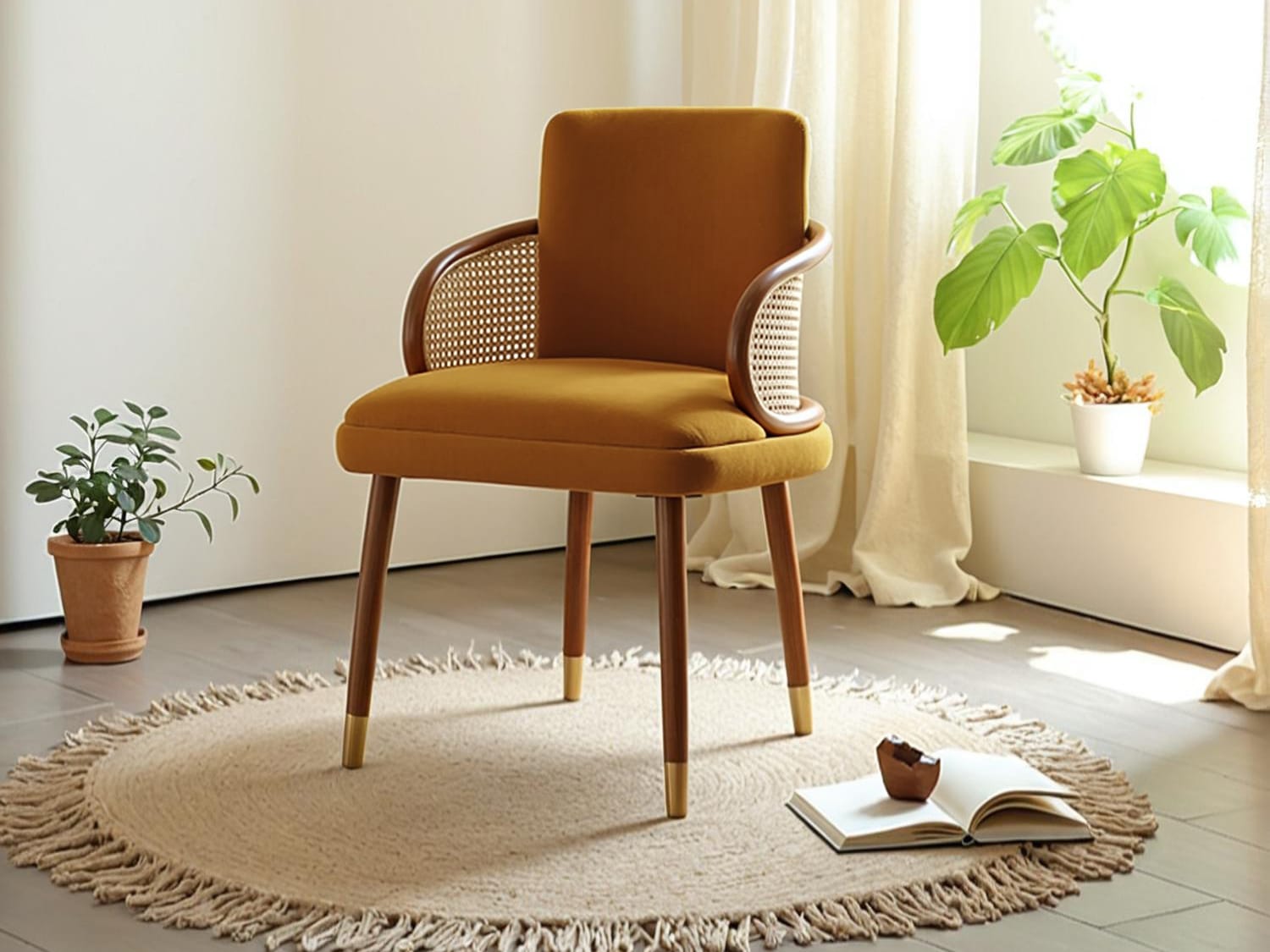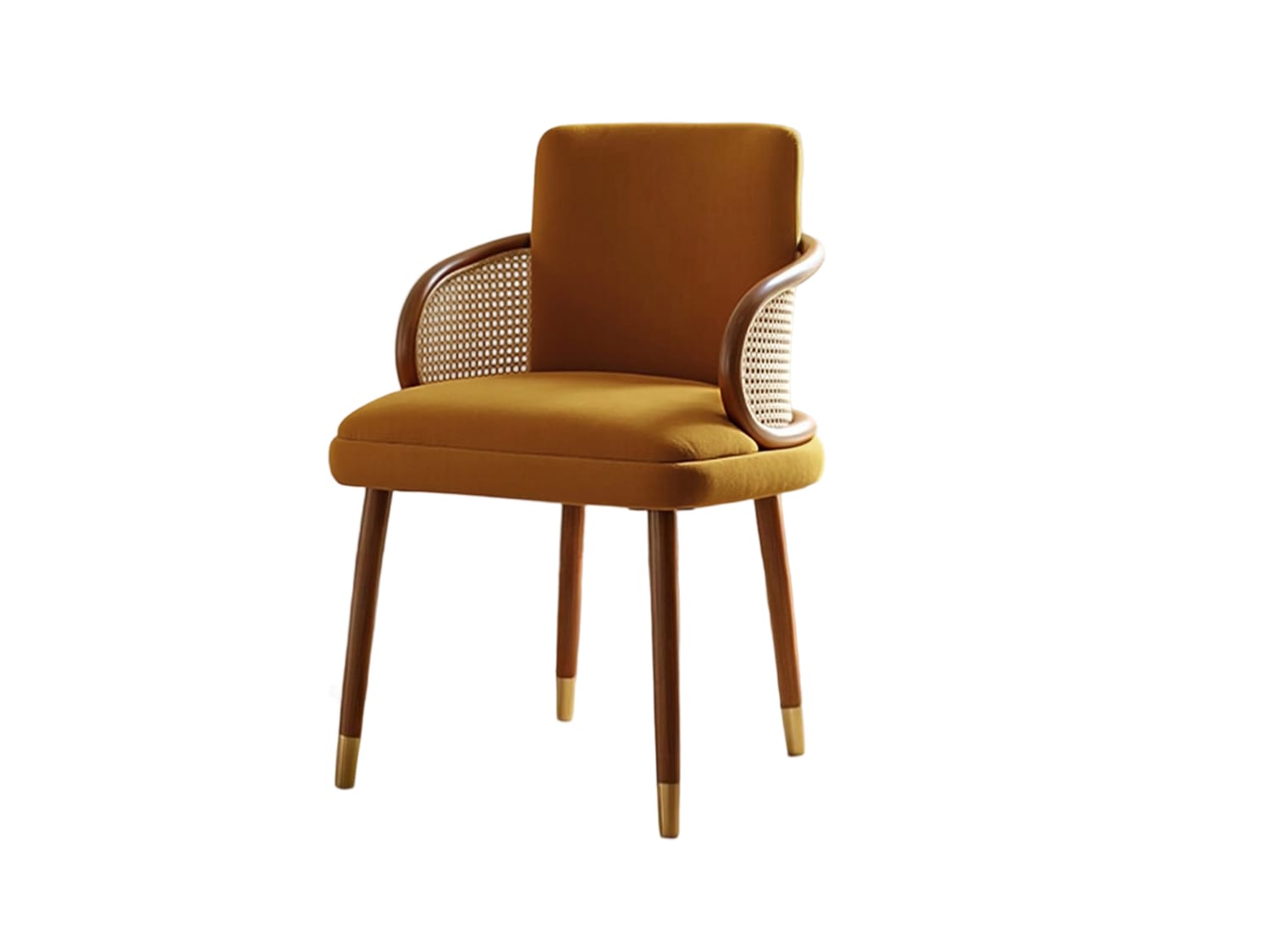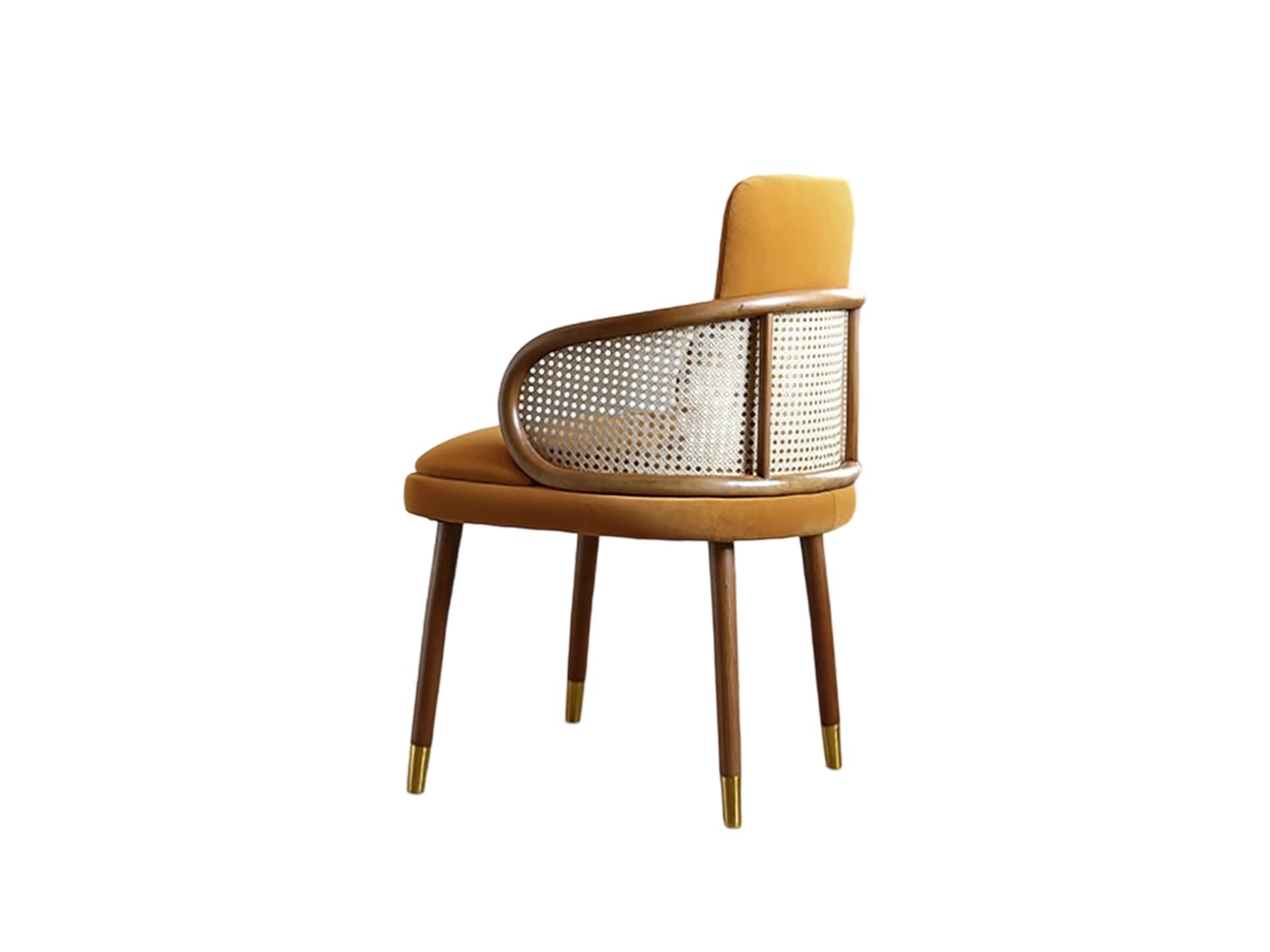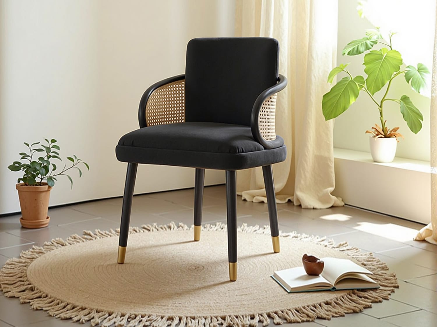 Elevate your dining experience with the Hepburn Modern Dining Chair, blending rich velvet suede upholstery with natural rattan accents in sophisticated Black, Off White and Ochre. The harmonious combination of plush fabric and woven texture creates visual depth, while the solid wood frame ensures lasting durability. Designed for both comfort and style, its gently curved backrest supports leisurely meals and lively conversations. This versatile piece transitions effortlessly from everyday family dinners to elegant entertaining, adding a touch of organic modernism to your carefully designed space.