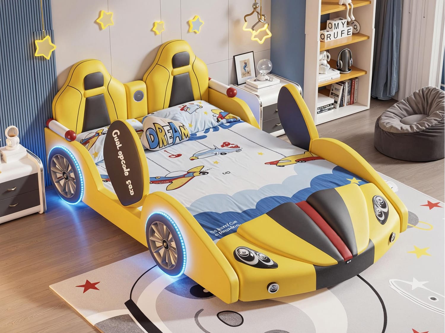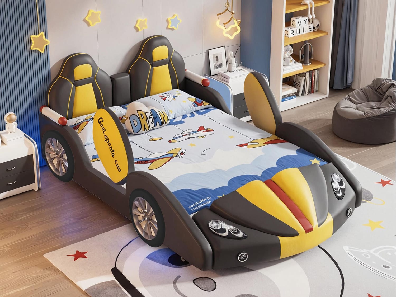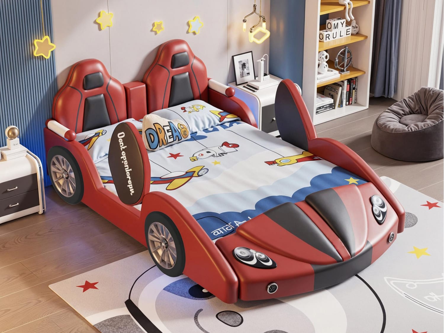 Transform your child’s room into a dreamy adventure zone with the Inaafu Creative CAR Bed Frame, ingeniously blending safety, fun, and tech-savvy design. This innovative bed features rounded safety corners and secure bedside rails for worry-free sleep, while the sturdy metal, solid wood, and plywood frame ensures exceptional stability.