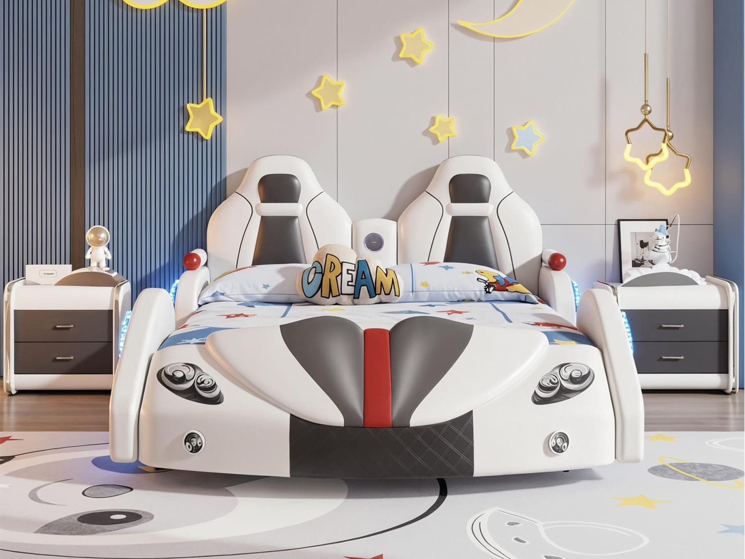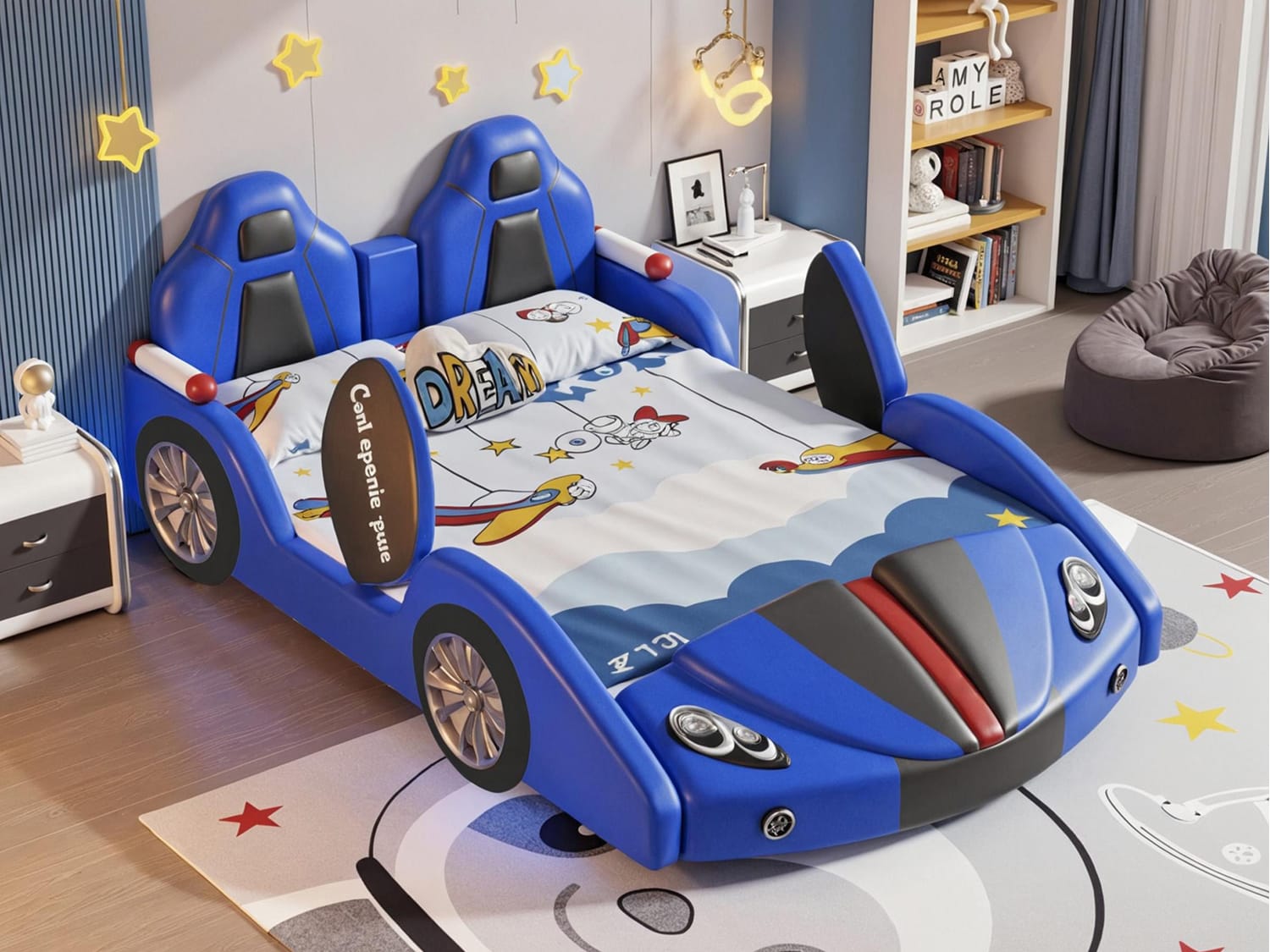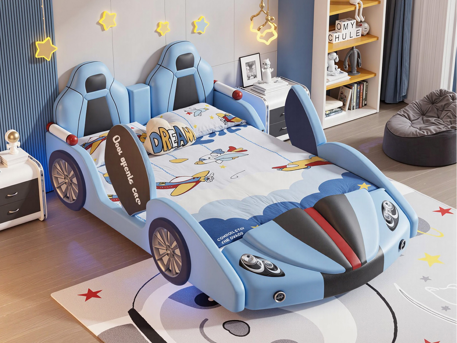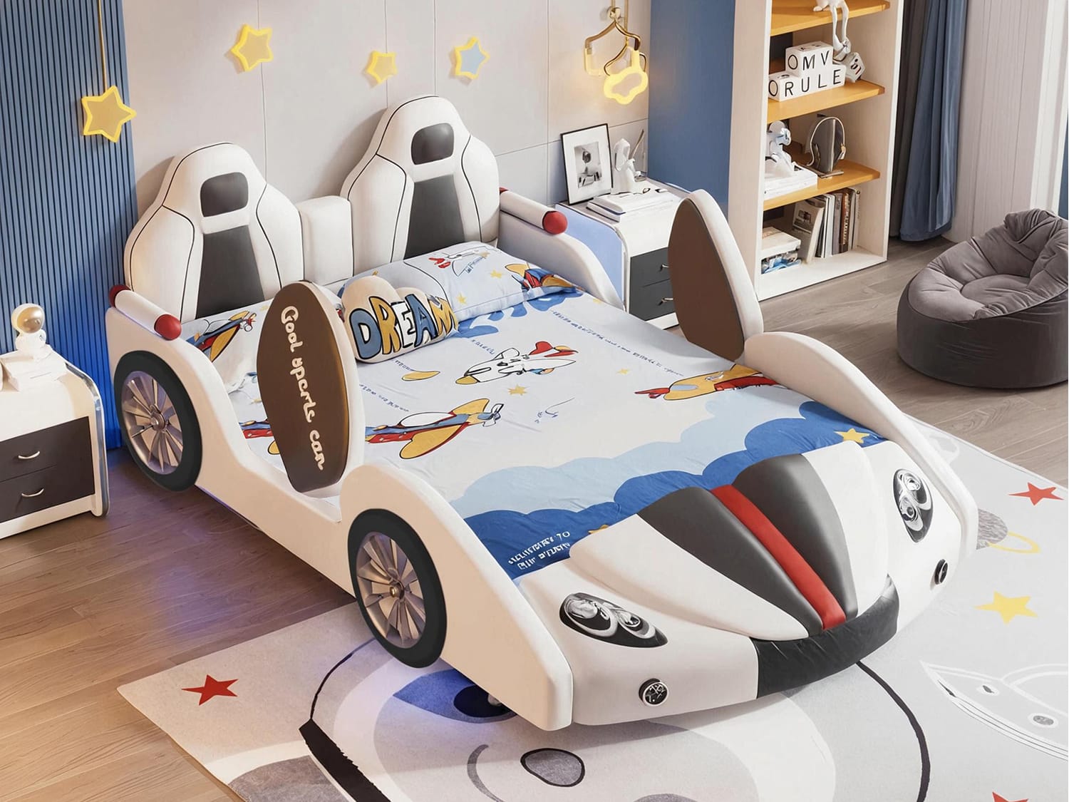 Transform your child’s room into a dreamy adventure zone with the Inaafu Creative CAR Bed Frame, ingeniously blending safety, fun, and tech-savvy design. This innovative bed features rounded safety corners and secure bedside rails for worry-free sleep, while the sturdy metal, solid wood, and plywood frame ensures exceptional stability.