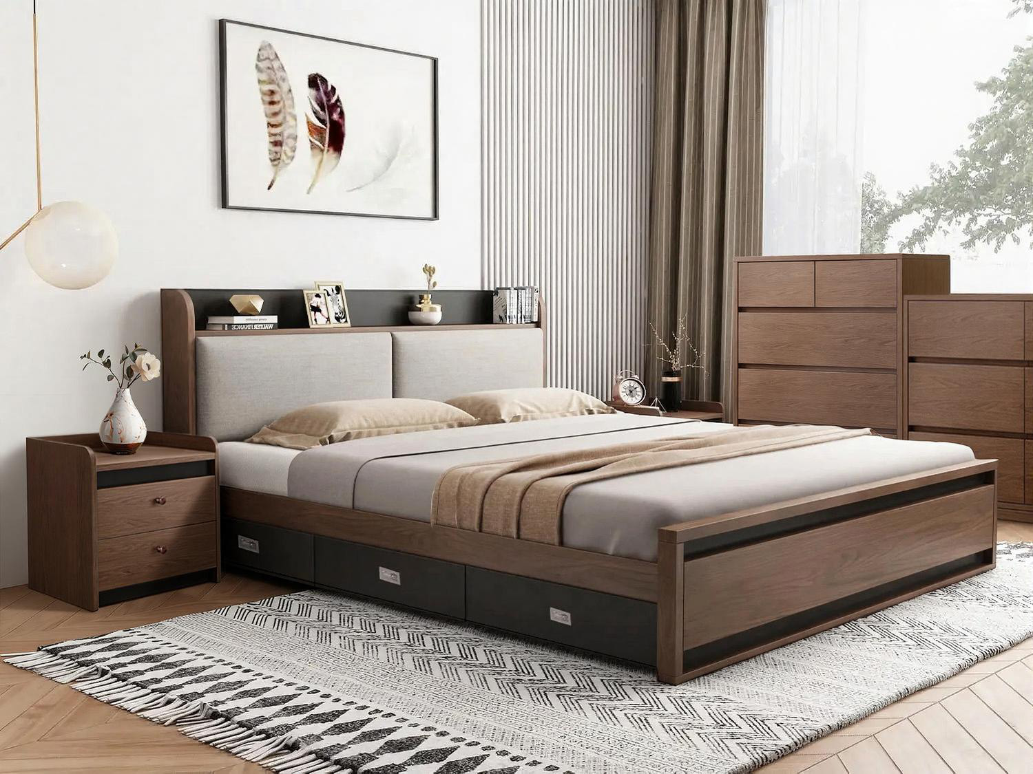 | Dimension | Queen Inner Dimension L203*W153cm Outer Dimension:L227* W159* H98.5cm King Inner Dimension:L203*W183cm Outer Dimension:L227* W189* H98.5cm Bedside table:L50*W40*H45cm 5 Drawer Chest:L60*W40*H100cm 6 Drawer Chest:L120*W40*H80cm |