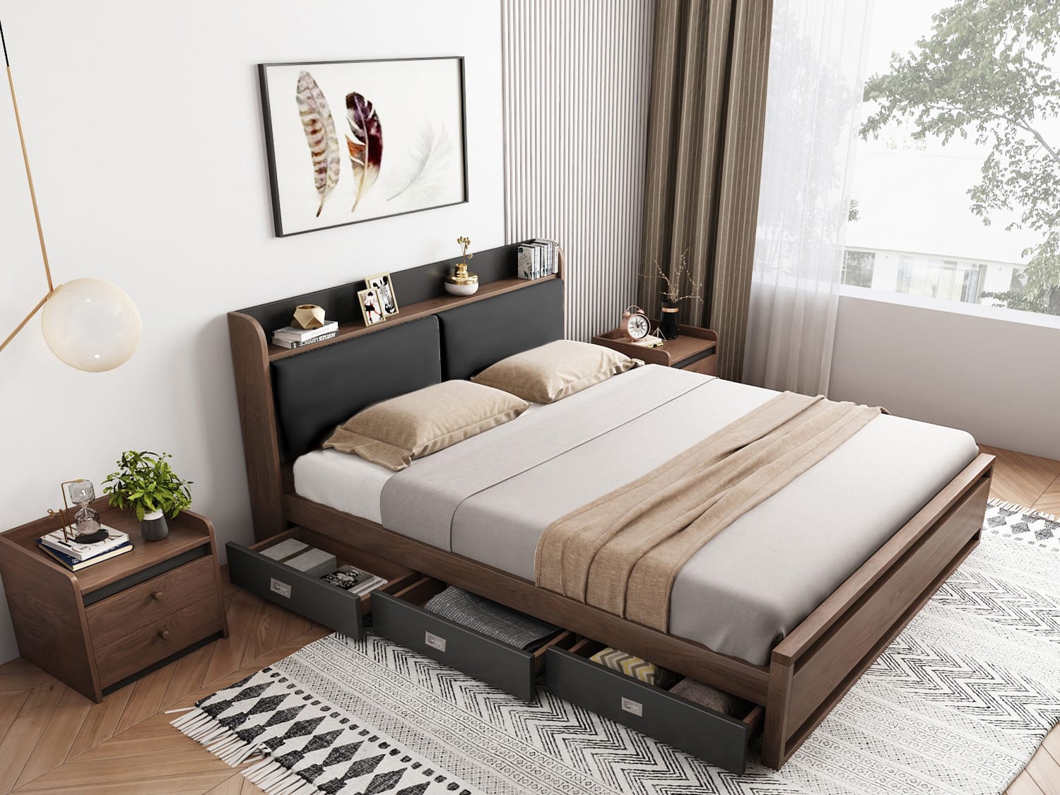 | Dimension | Double Inner Dimension L188*W137cm Outer Dimension:L212* W143* H98.5cm Queen Inner Dimension L203*W153cm Outer Dimension:L227* W159* H98.5cm King Inner Dimension:L203*W183cm Outer Dimension:L227* W189* H98.5cm Bedside table:L50*W40*H45cm |