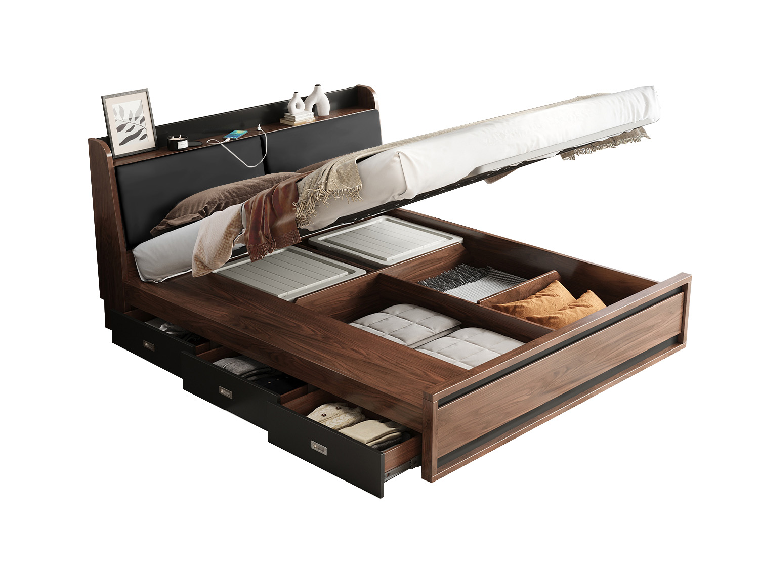 Janice Wooden Multi Functional Gas Lift Bed With Storage-Black Leather-Queen/King