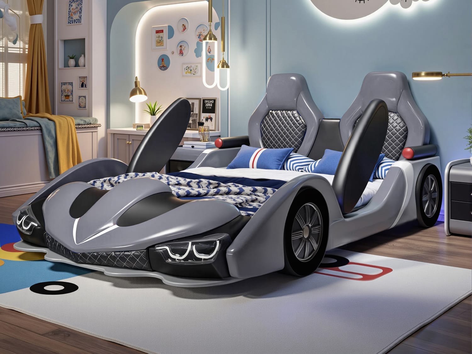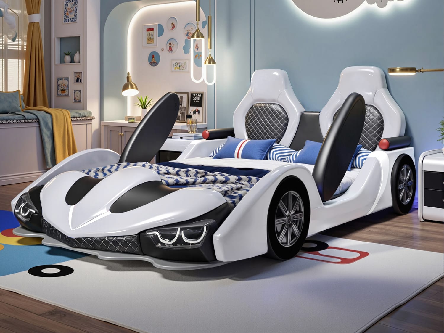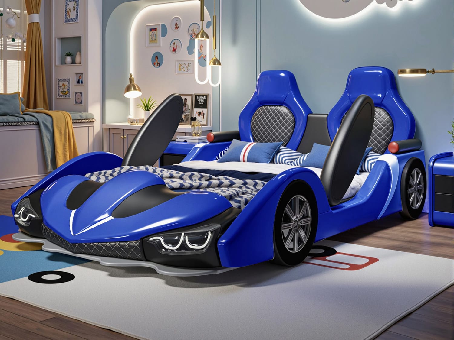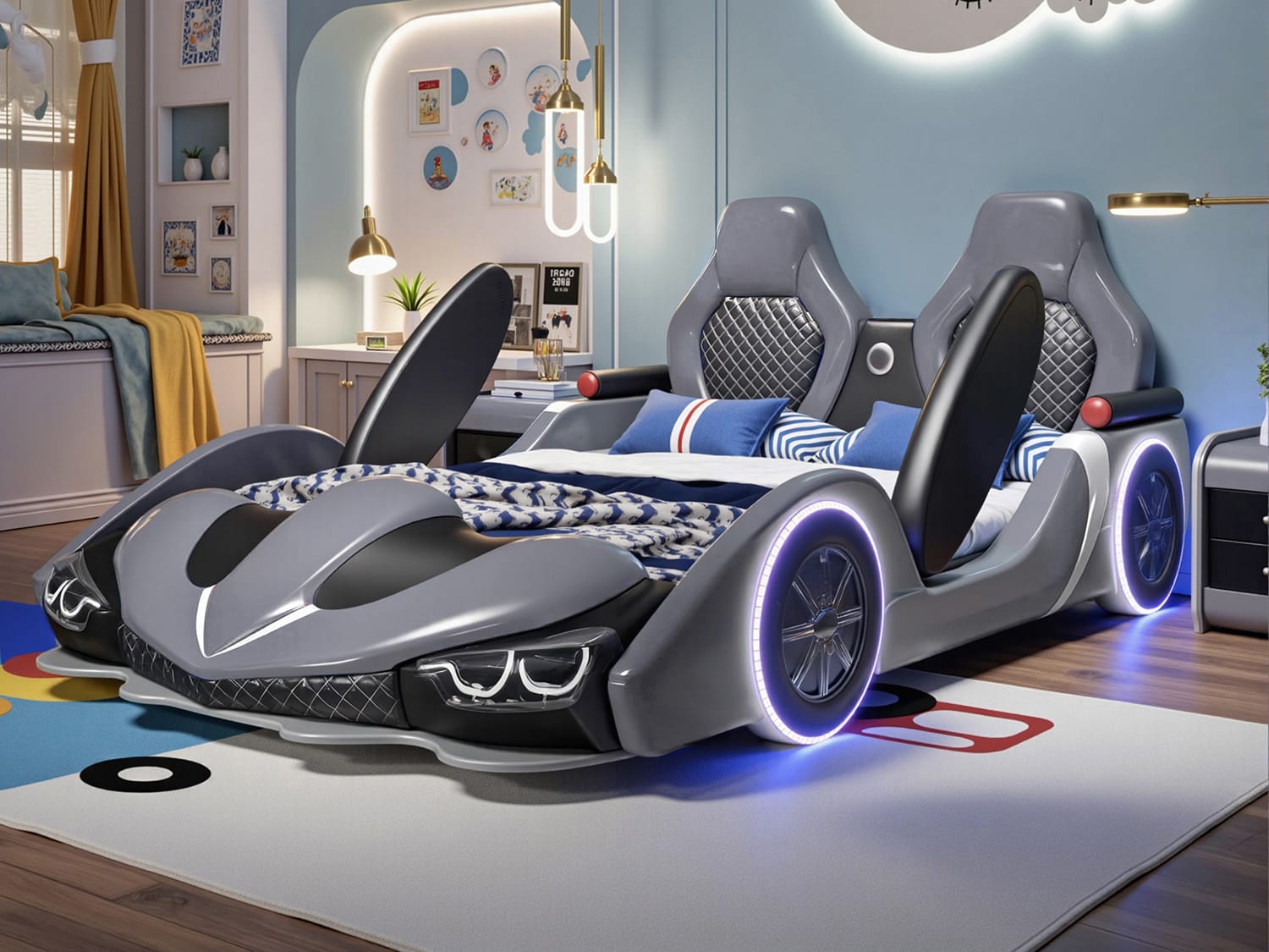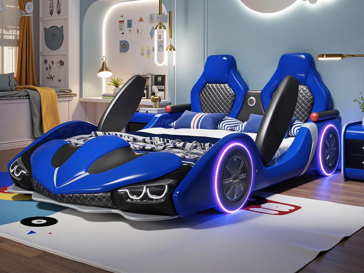The Kada Creative Design With/Without Bluetooth speaker CARS Kid’s Bed Frame is available in King Single,Double and Queen sizes, allowing you to choose the perfect fit for your child’s bedroom. With its round safety corner design, stable structure, creative cartoon features, safety bedside rail, with/without luminous wheel foot, with/without Bluetooth speaker, creative scissor door, microfiber leather, high-density foam, and metal + solid wood + plywood construction, this bed frame offers a secure, imaginative, and comfortable sleep space for your child.