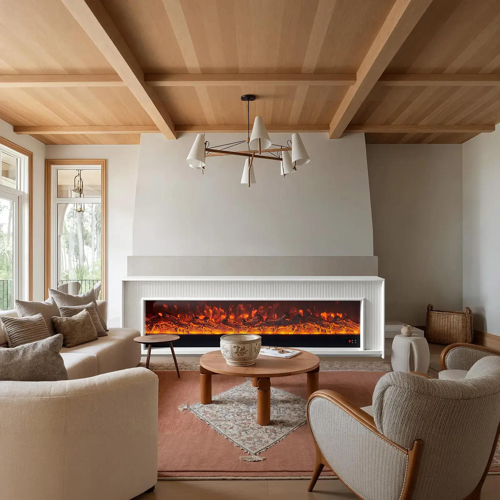 Designed to complement both contemporary and classic interiors, the Kellyville Electric Fireplace delivers gentle warmth and refined visual appeal. Featuring a realistic LED flame and optional heating, it is available in 200CM size, with your choice of White or Cream finish.
