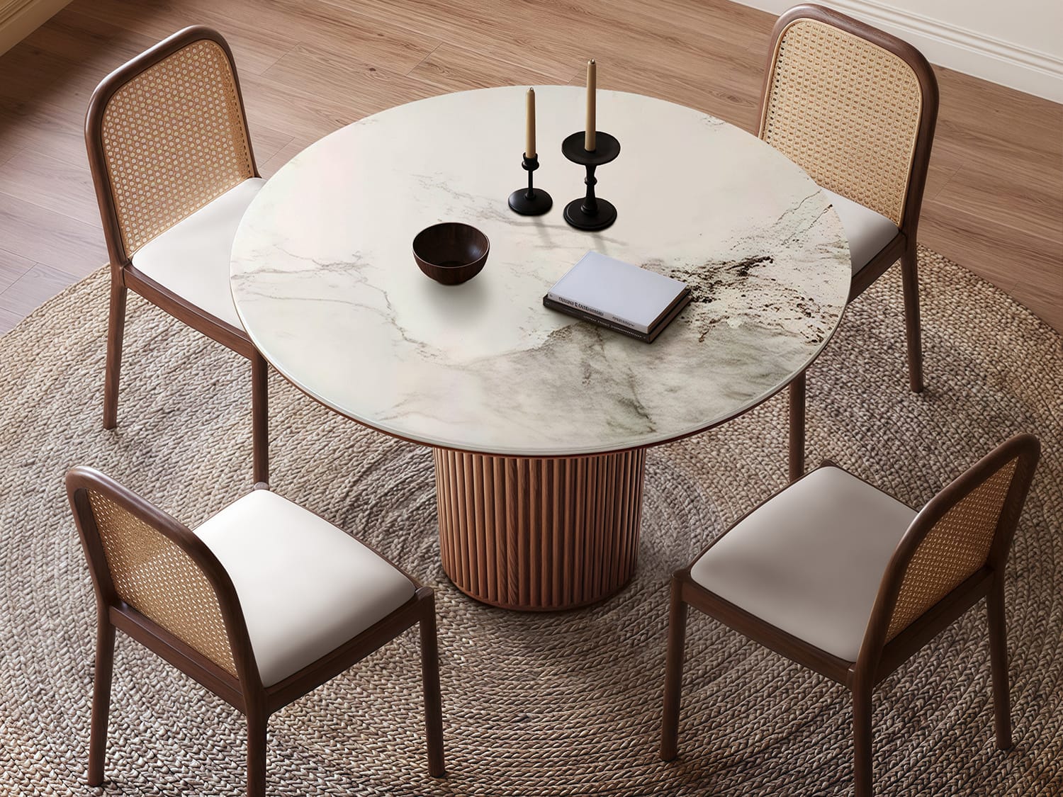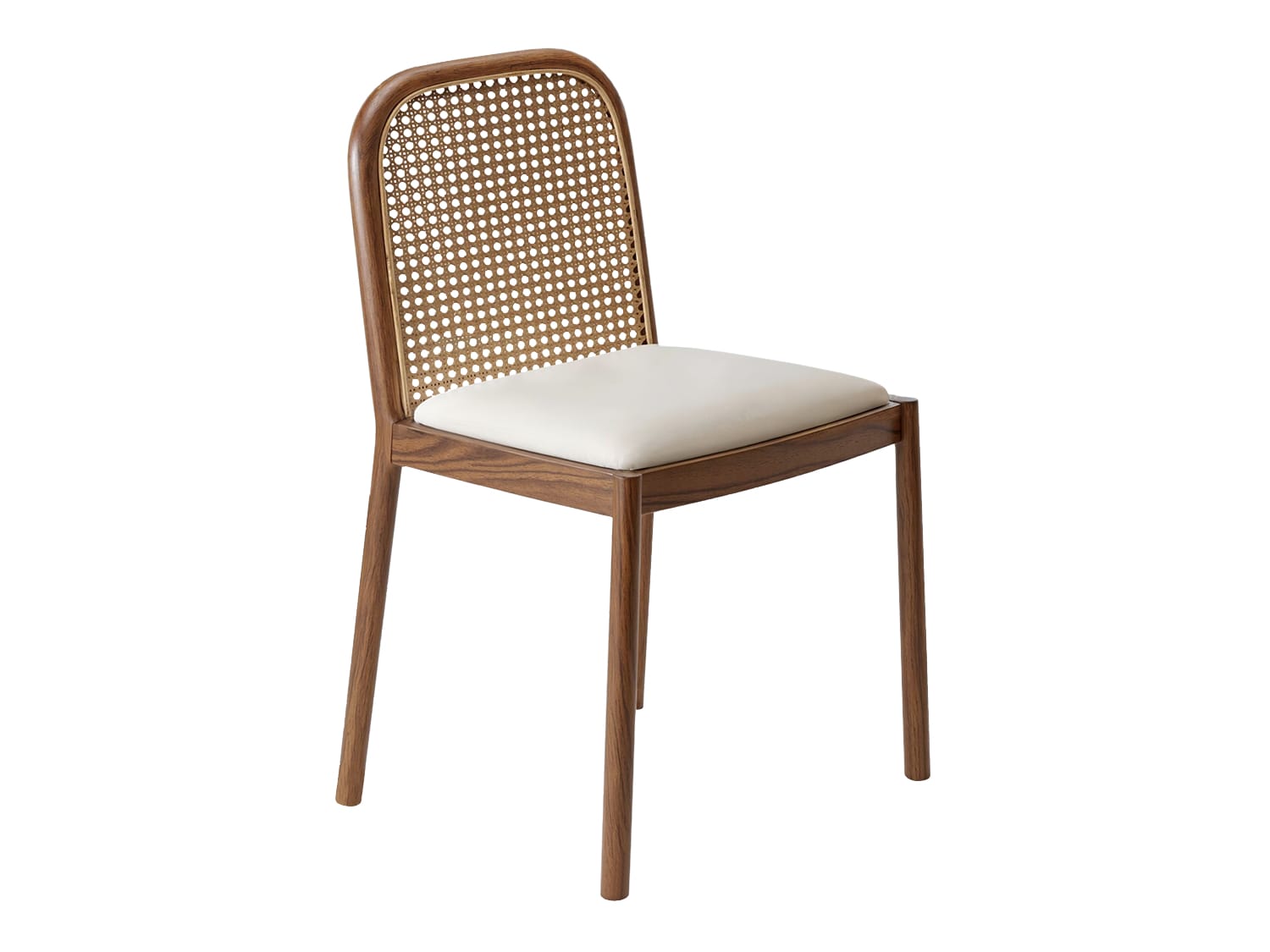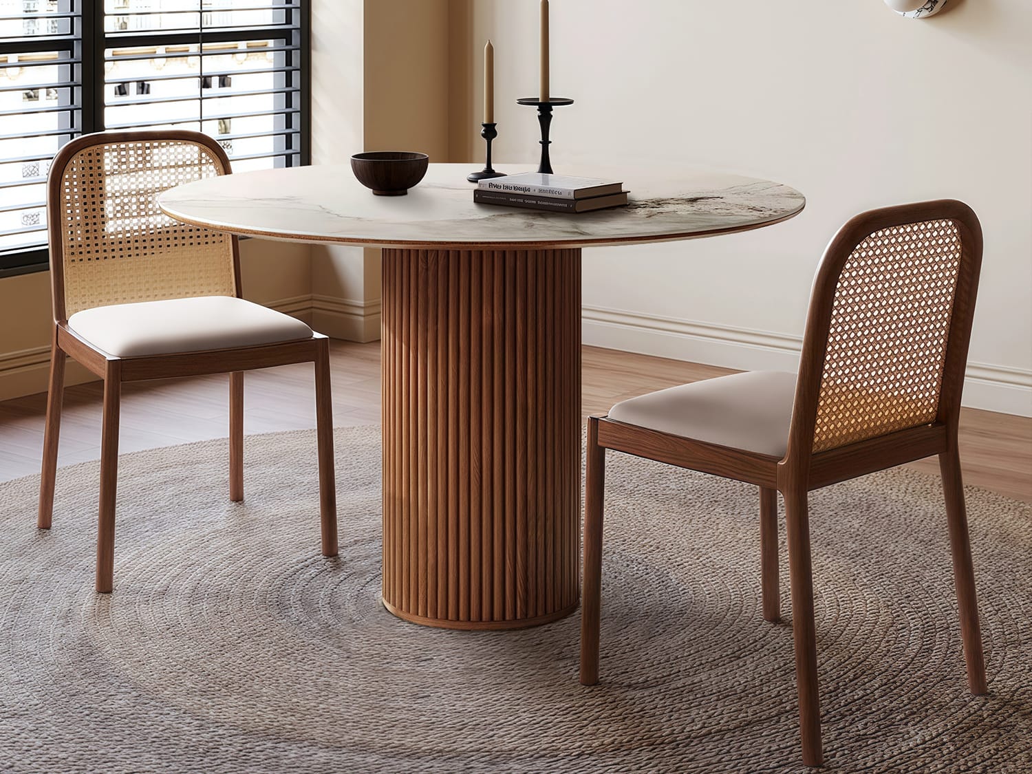 Elevate your dining experience with the Malvern Modern Dining Chair, blending ergonomic design with artisanal craftsmanship. The chair features a handwoven rattan backrest using traditional vine weaving techniques, paired with premium microfiber leather upholstery for luxurious comfort.