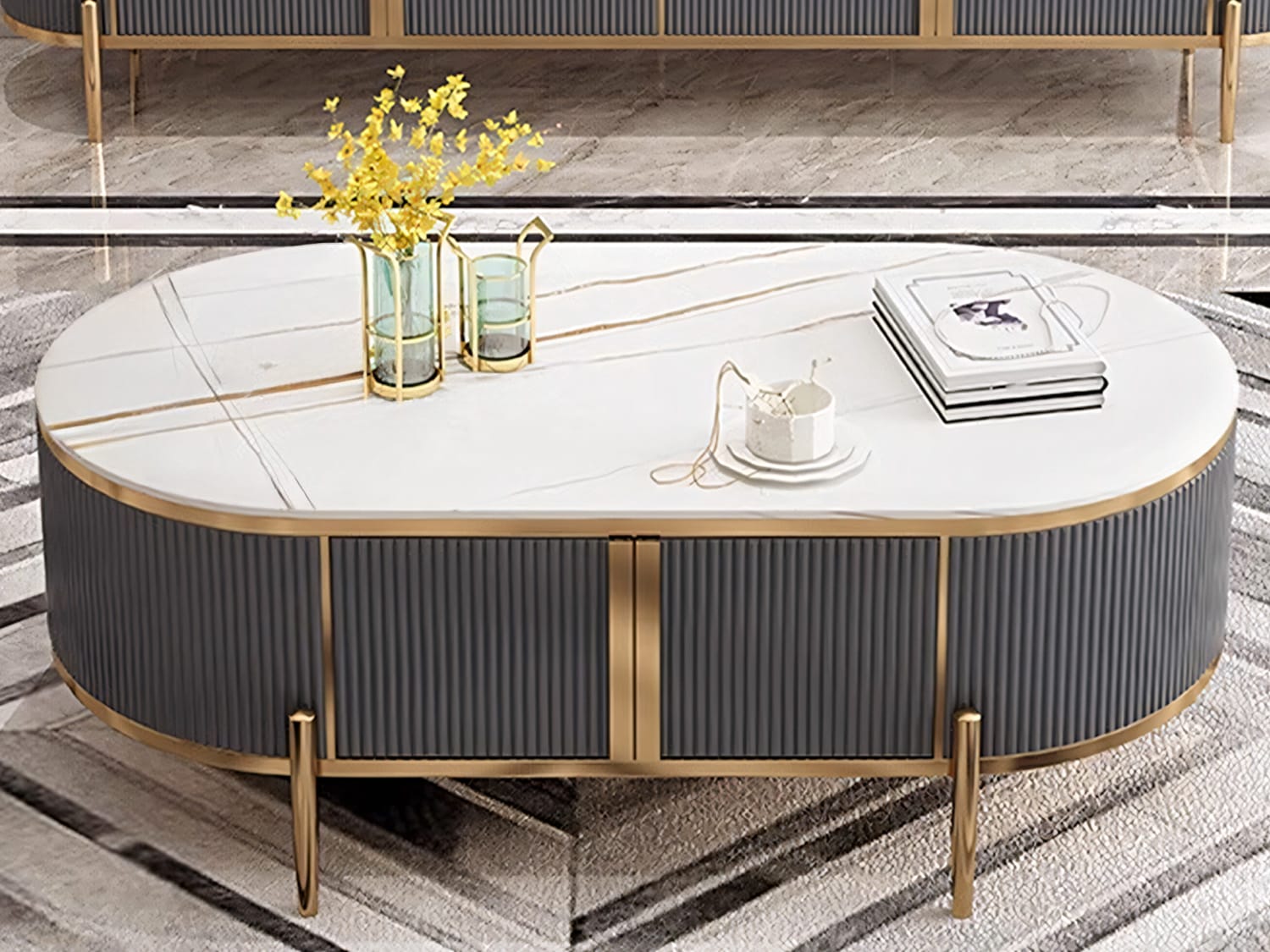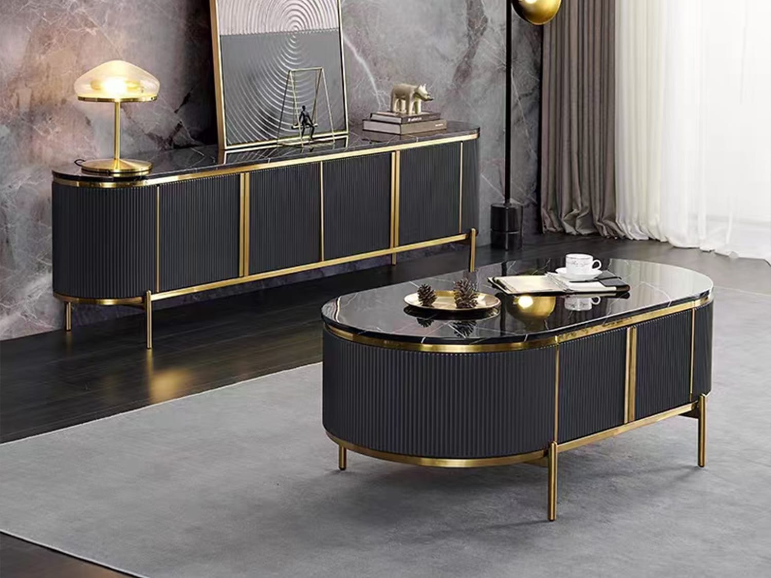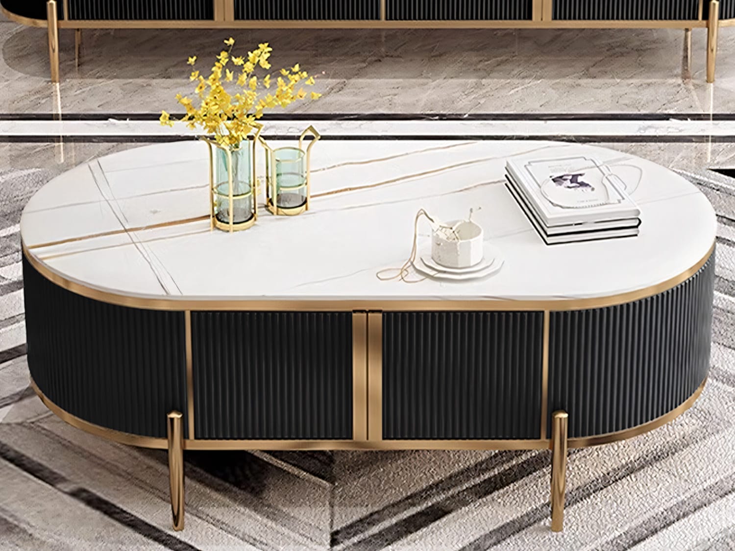 This modern-looking coffee table is made of marble-sintered stone, which looks very elegant and has a fine texture. The top is polished and smooth and looks warm together with the stainless steel frame. The storage space underneath can store remote controllers, magazines, snacks or any other stuff.