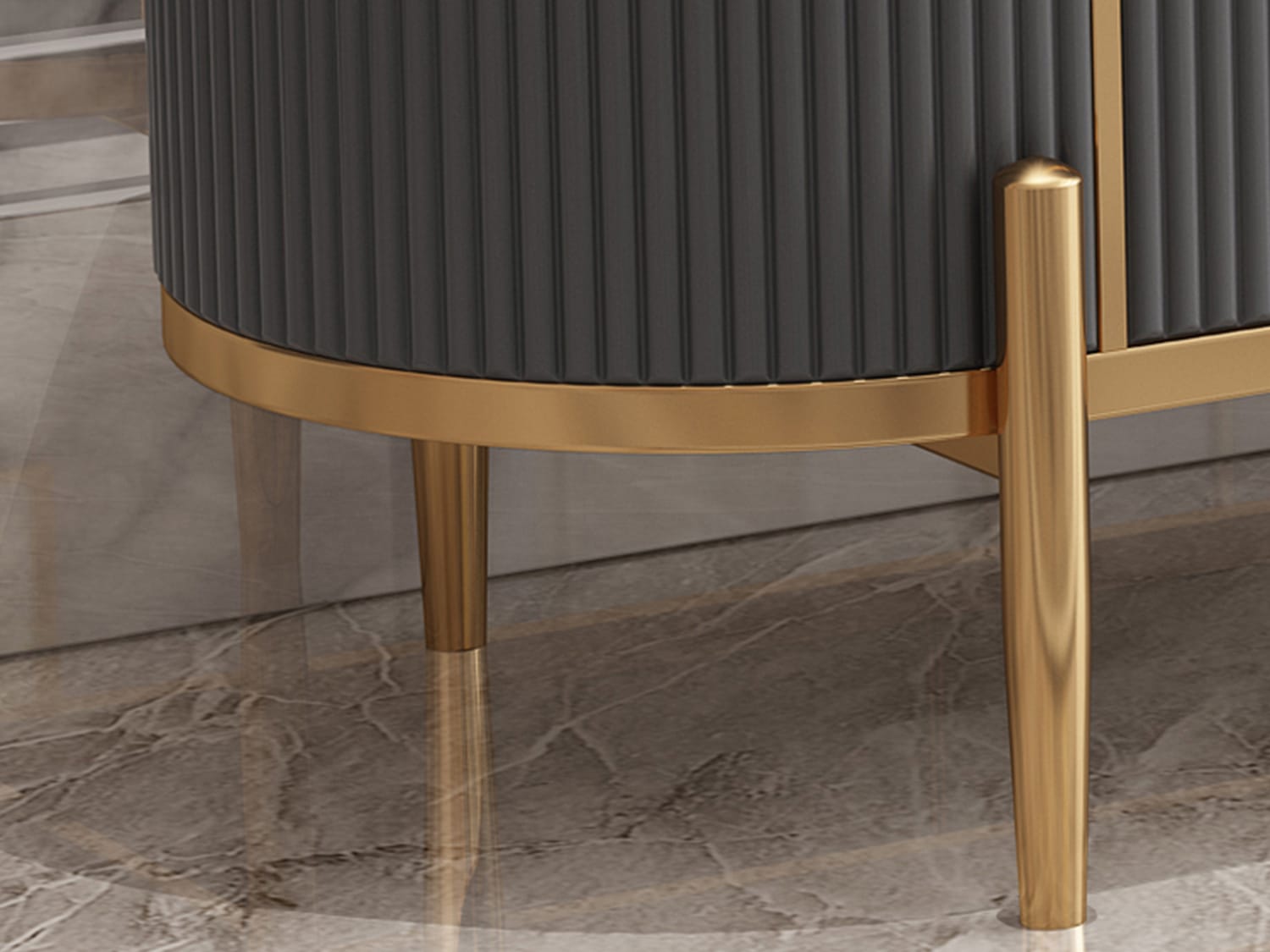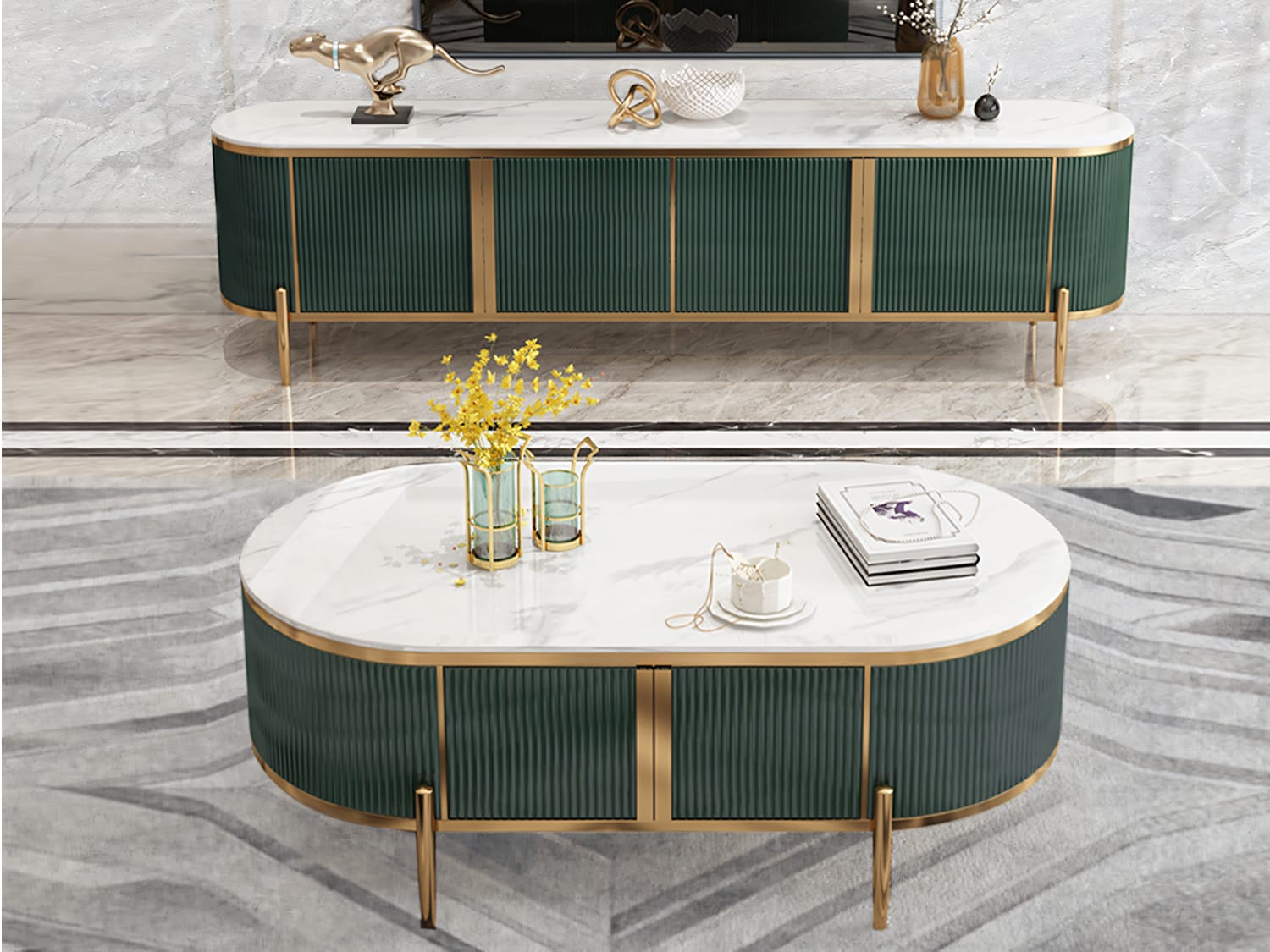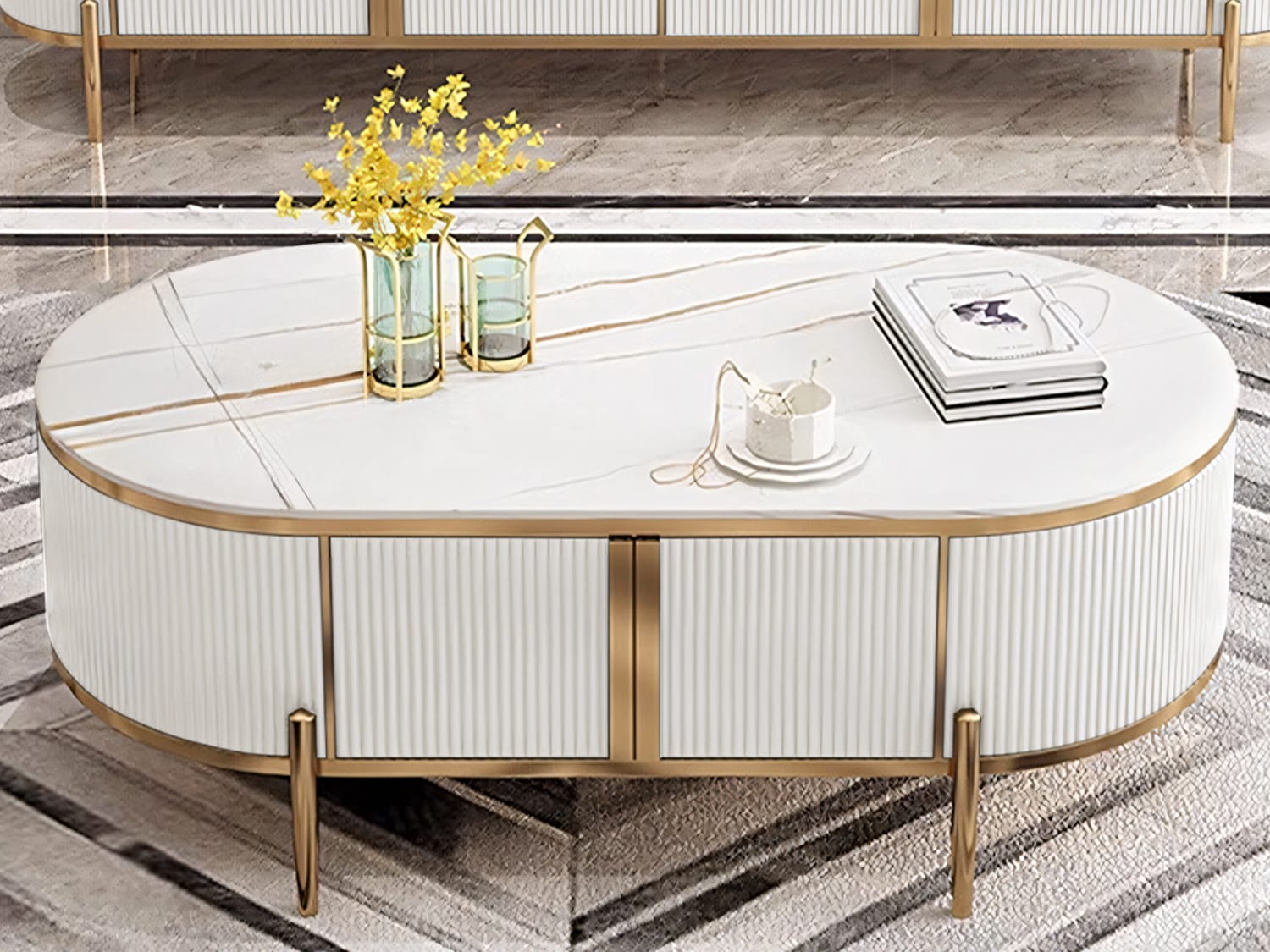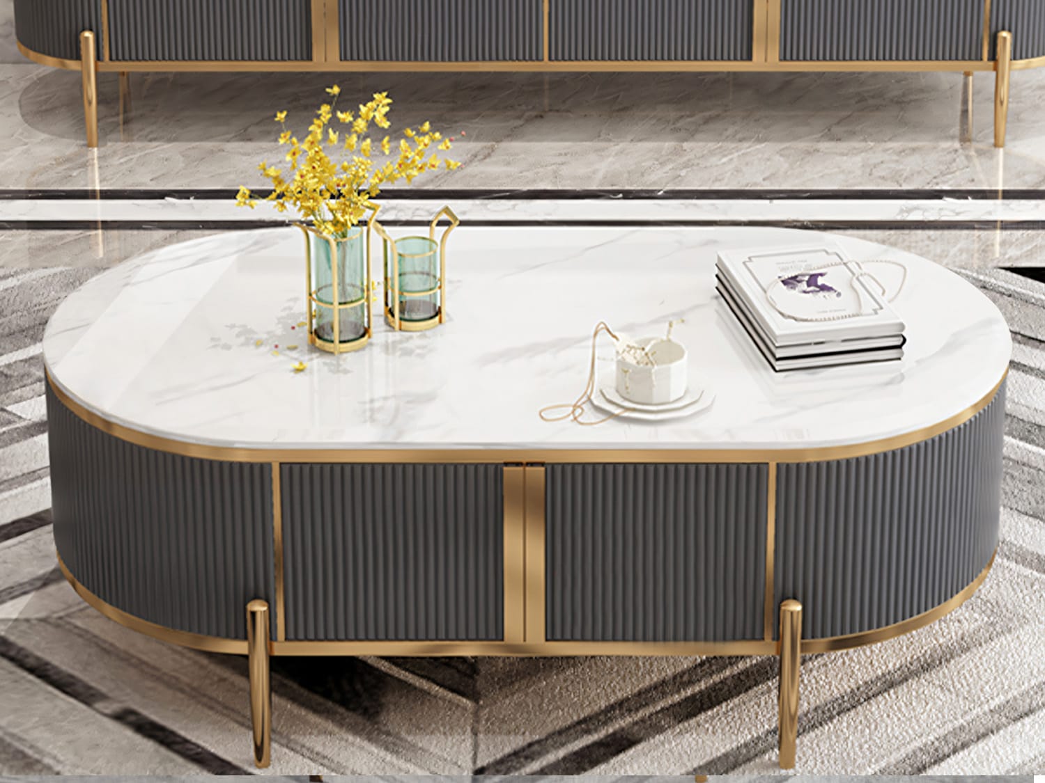This modern-looking coffee table is made of marble-sintered stone, which looks very elegant and has a fine texture. The top is polished and smooth and looks warm together with the stainless steel frame. The storage space underneath can store remote controllers, magazines, snacks or any other stuff.