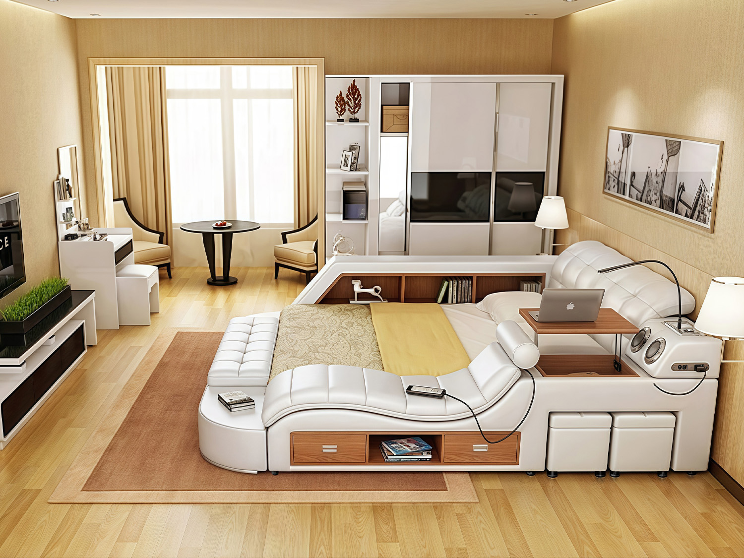 Experience the pinnacle of comfort and luxury with our Multi-Functional Smart Bed with Massage Chaise in Cream. Designed to revolutionize your bedroom, this bed combines versatility, functionality, and cutting-edge technology to provide you with an unparalleled sleep experience.