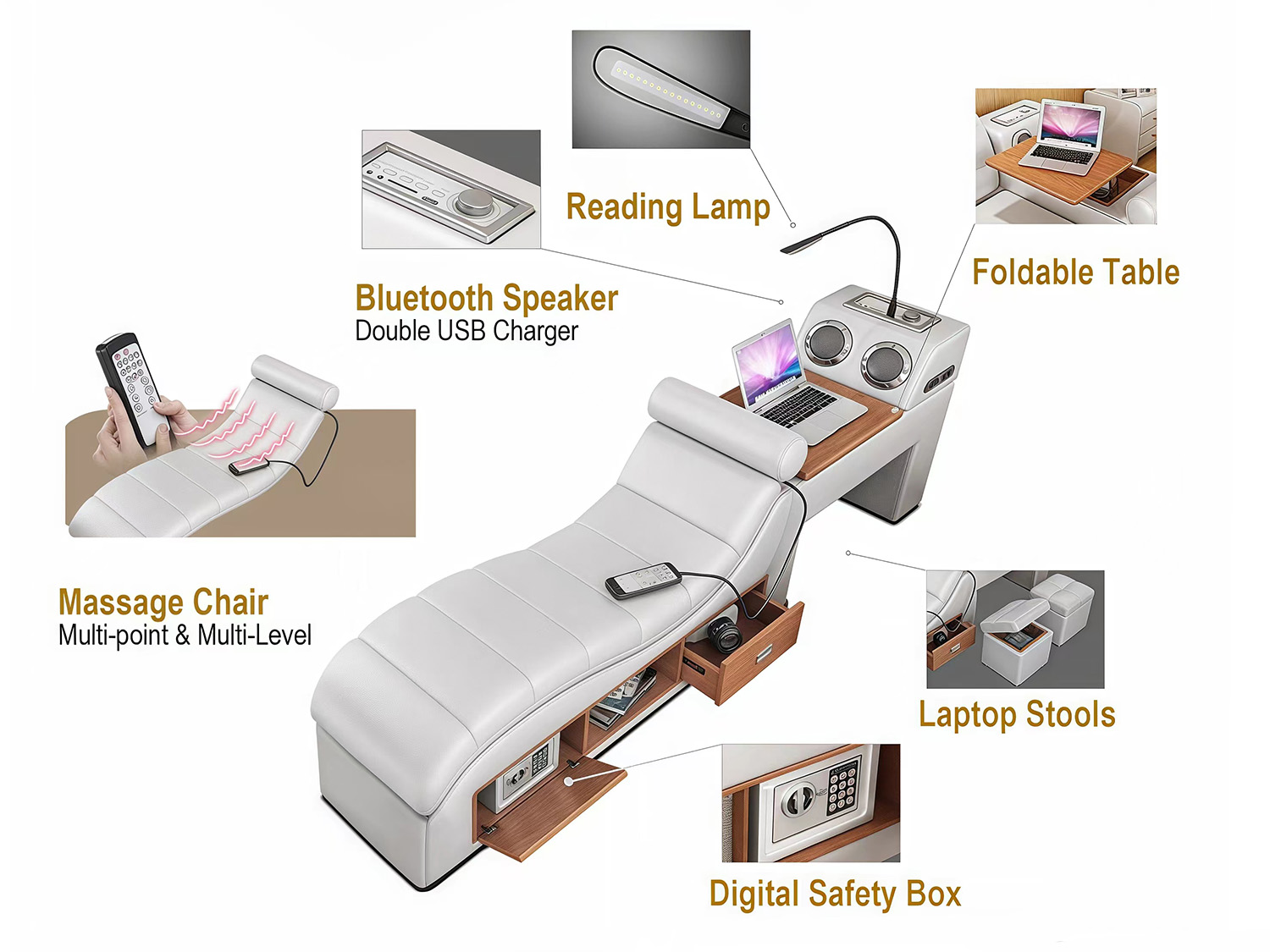 | Feature | Modern Design Crafted and constructed durable LED Reading light liftable side table Massage Chaise Digital Home Safe iPhone, iPad, iPod and Android player system USB Recharge Bluetooth Speaker function |