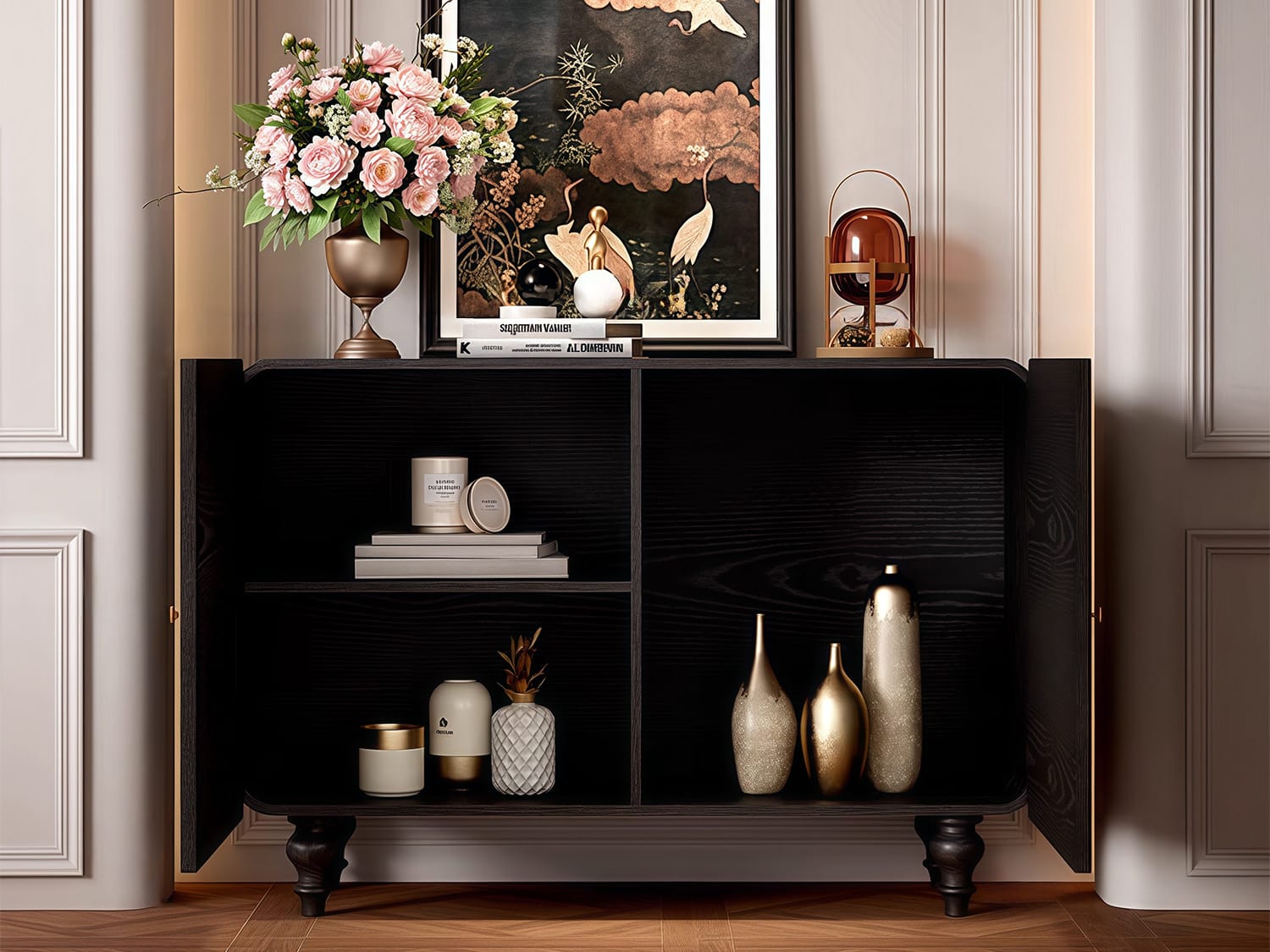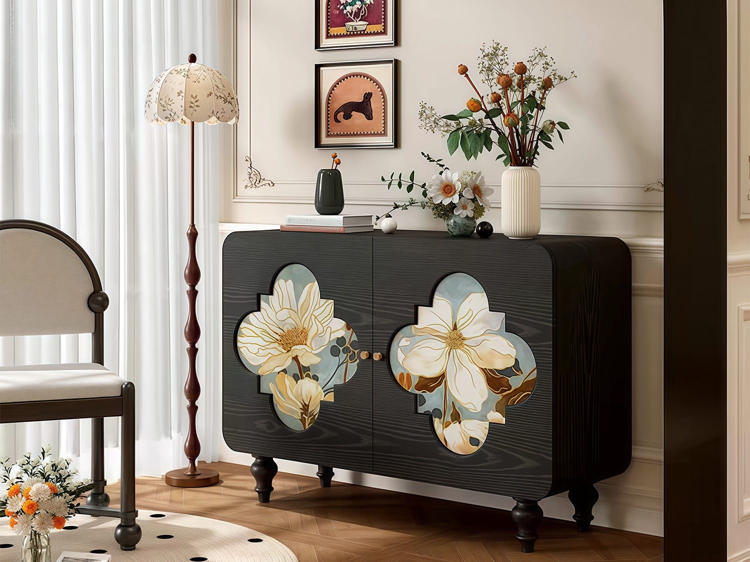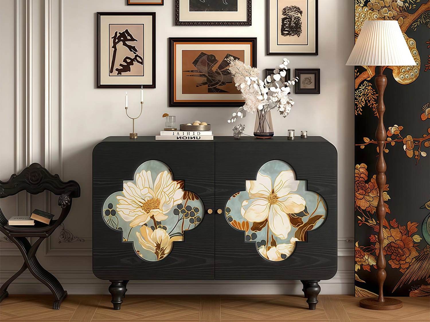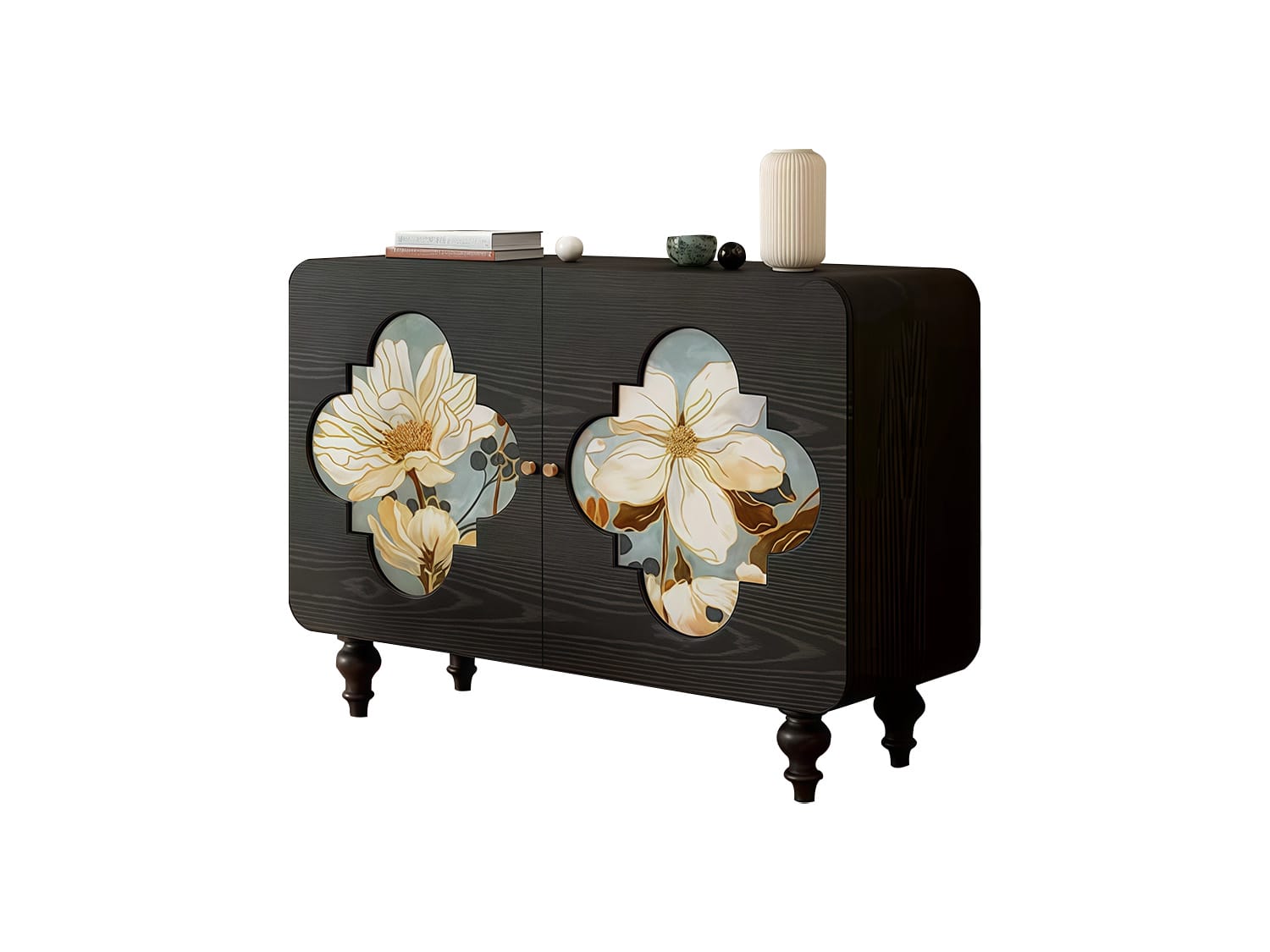 The Pampa Retro Storage Cabinet/Buffet combines timeless elegance with practical functionality. This cabinet is made of solid wood and features a vibrant, artistic design that makes it a standout piece in any space. The doors are adorned with intricate geometric patterns, abstract shapes, and nature-inspired elements, including animals and plants, creating a visually striking composition. The use of bold colors enhances its lively and dynamic appearance, making it not just a functional storage unit but also a statement piece of decor. Its vintage-style stacked legs add a sense of uniqueness and elegance, contributing to its handcrafted charm. The combination of artistic expression and practical functionality makes this cabinet a perfect addition to a living room, bedroom, or hallway, bringing character, warmth, and personality to the home.