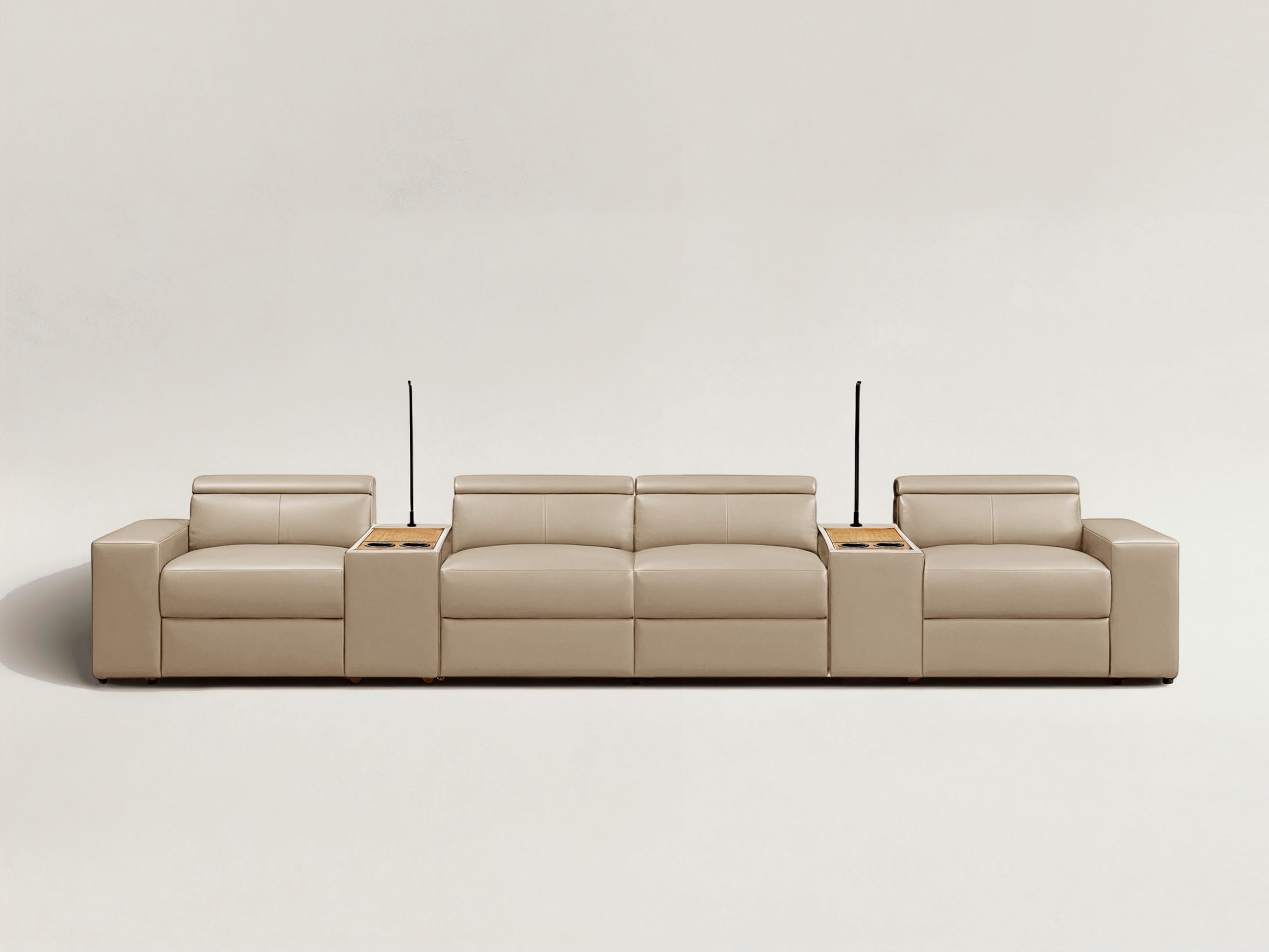 Piora Leather Modular Electric 4-Seater Recliners Lounge with USB chargers/Headrests/Footrests in Tan/Black/Oatmeal colour-With 2 Console