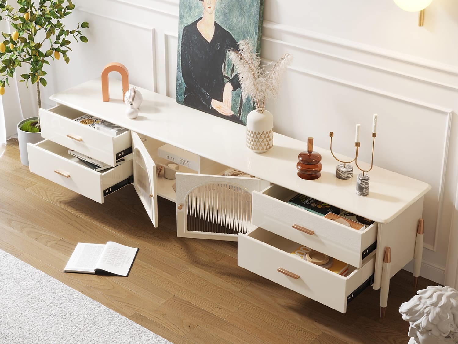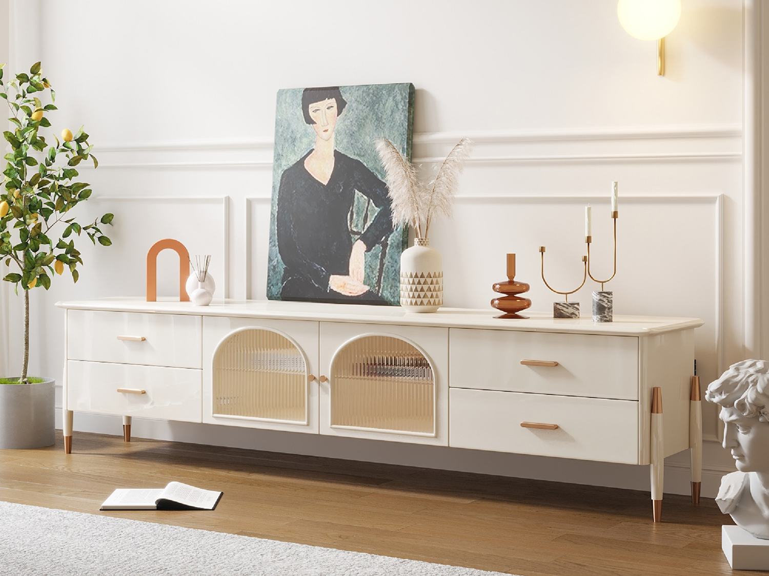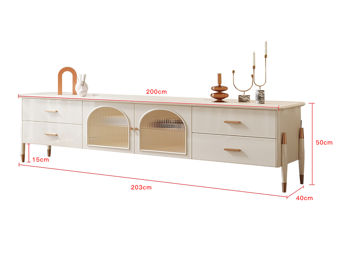 Your home’s living room is the perfect spot for this stunning piece of furniture. Featuring a combination of MDF panel, solid wooden legs, and a golden metal knob, it creates a warm and welcoming space where you can keep your coats or hang up keys. The glossy paint finish adds the final touch to this beautiful TV unit. LED lighting ensures that it shines brightly for your guests. And with tempered glass to protect it from any bumps or knocks, this piece will remain as stylish as ever.