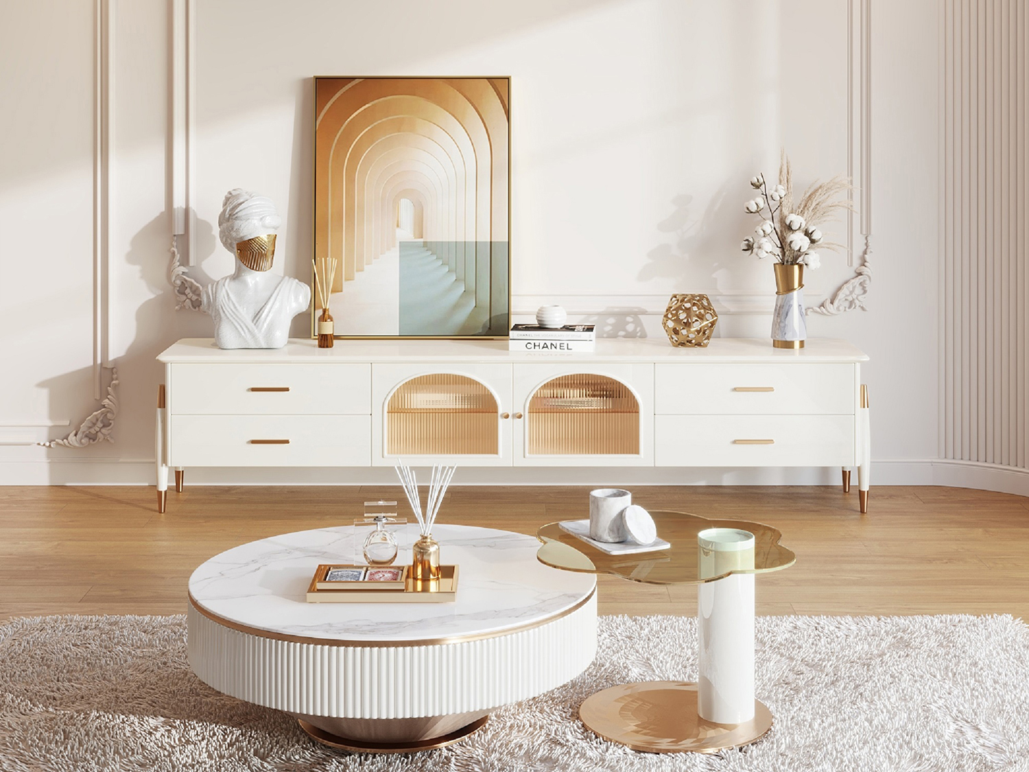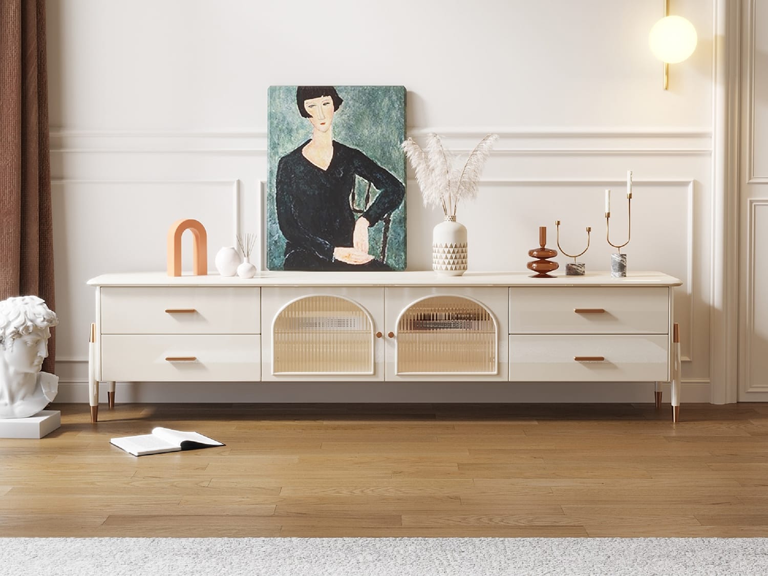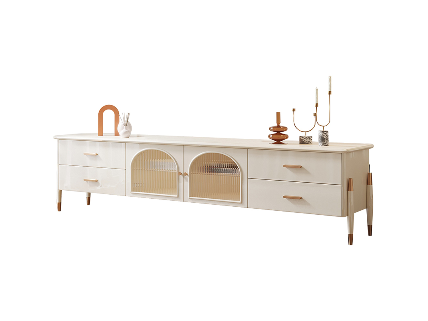 Your home’s living room is the perfect spot for this stunning piece of furniture. Featuring a combination of MDF panel, solid wooden legs, and a golden metal knob, it creates a warm and welcoming space where you can keep your coats or hang up keys. The glossy paint finish adds the final touch to this beautiful TV unit. LED lighting ensures that it shines brightly for your guests. And with tempered glass to protect it from any bumps or knocks, this piece will remain as stylish as ever.