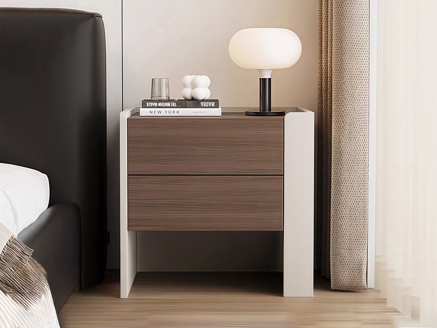 Discover the elegance of minimalism with the Sumas Modern Wooden Bedside Table. This bedside table features an Italian minimalist style that blends seamlessly with any modern décor. The hidden handle provides a sleek and unobstructed look, while the storage drawer offers convenient space for your essentials. The silent glide rail ensures smooth and quiet opening and closing, adding to the table’s overall appeal. The drop-proof top design provides added safety and stability. Crafted from medium density fiberboard, this bedside table is both sturdy and stylish, making it a perfect addition to your bedroom.