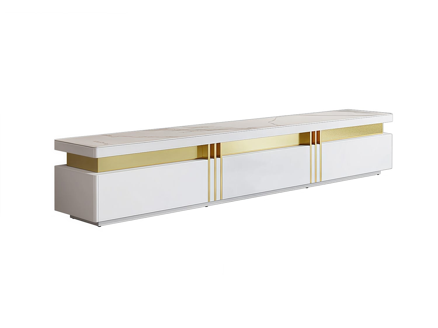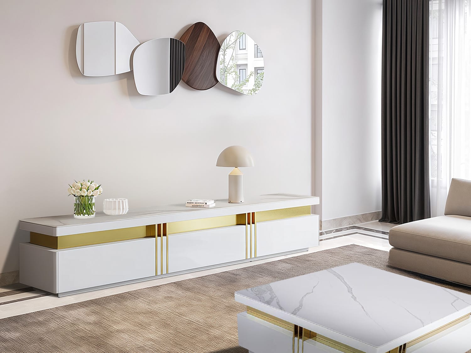 Elevate your living space with our Swansea TV Unit. Crafted from a sturdy blend of solid wood and plywood, it boasts a sleek marble sintered stone top that’s both waterproof and moisture-proof. The surface is highly wear-resistant and scratch-resistant, ensuring long-lasting beauty. The unit features storage drawers for media essentials. Stainless steel accents add a touch of sophistication to this modern masterpiece.