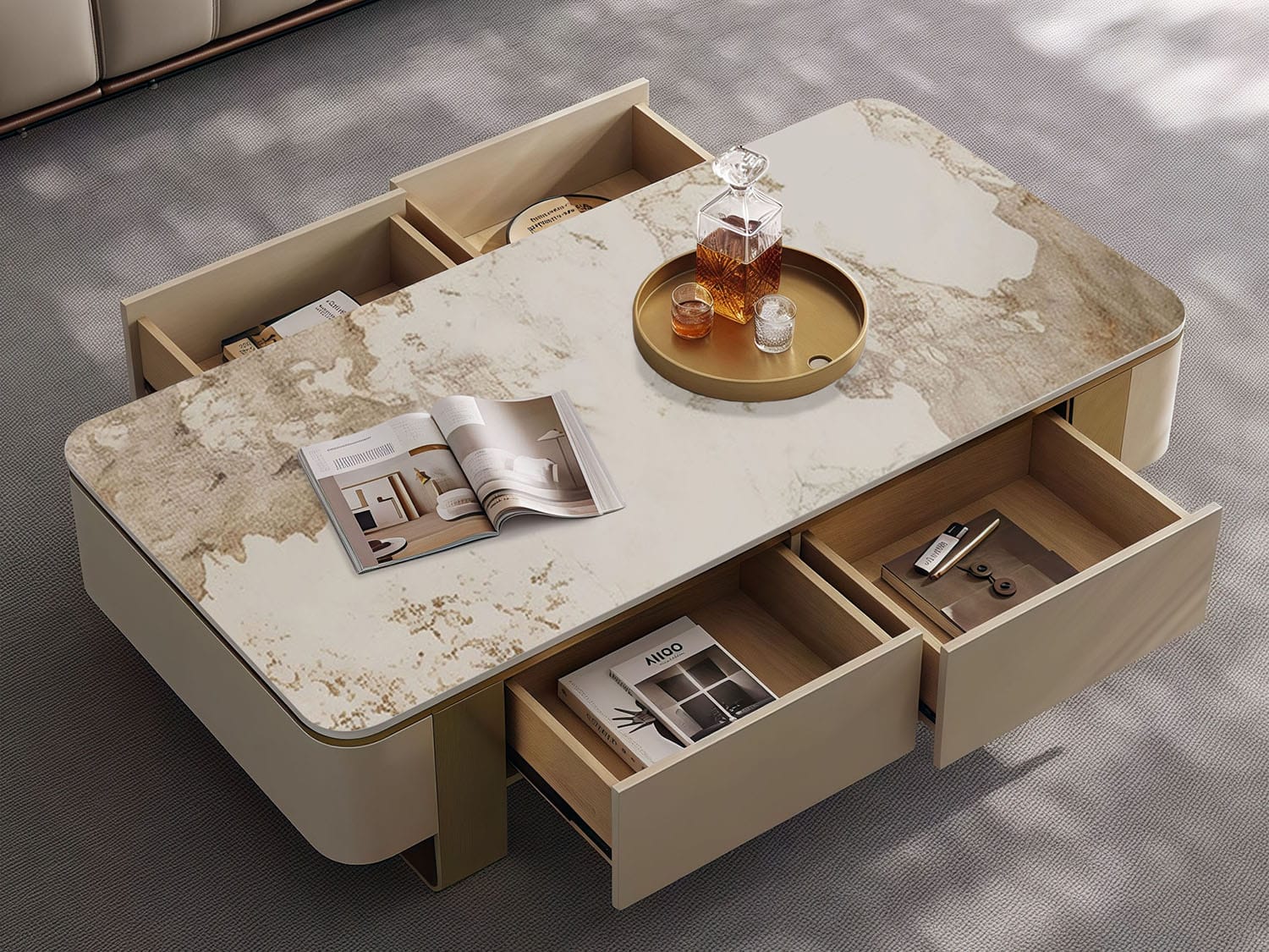 Designed for both style and functionality, this coffee table includes spacious storage drawers to keep your living room clutter-free. Crafted from high-quality sintered stone and plywood, it combines contemporary design with practical storage solutions.