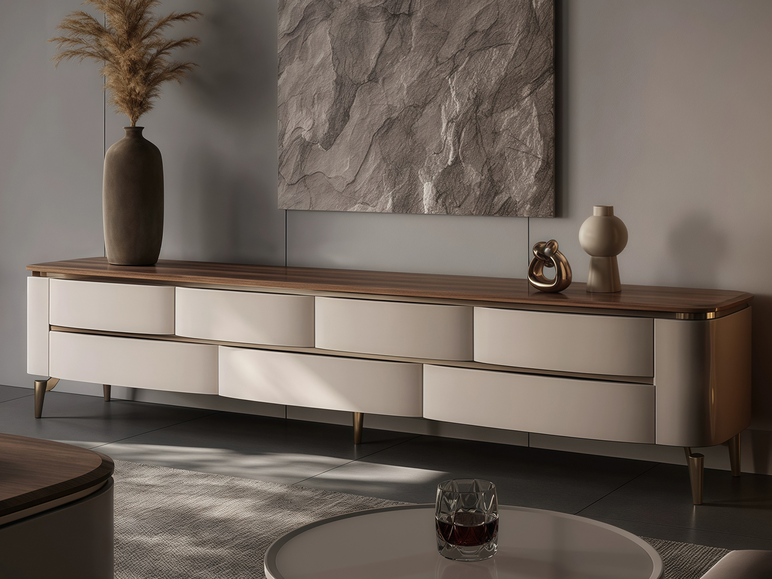 Perfect for modern interiors, the Trinchera TV unit blends warm wood tones with durable metallic accents, creating a striking yet functional centerpiece for your living space.