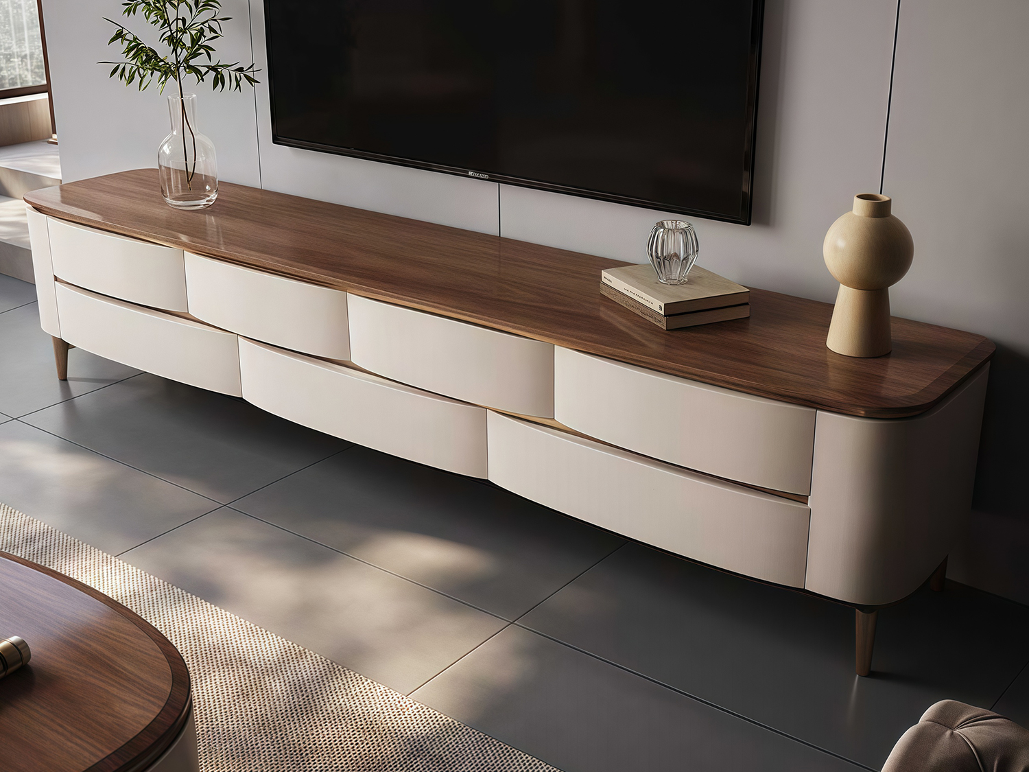 Designed with sleek storage drawers for organized media storage, this fashion-forward TV unit combines practicality with contemporary style. The stainless steel feet add modern elegance while providing sturdy support.