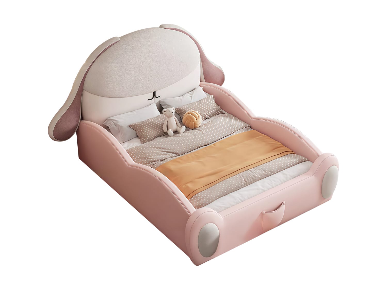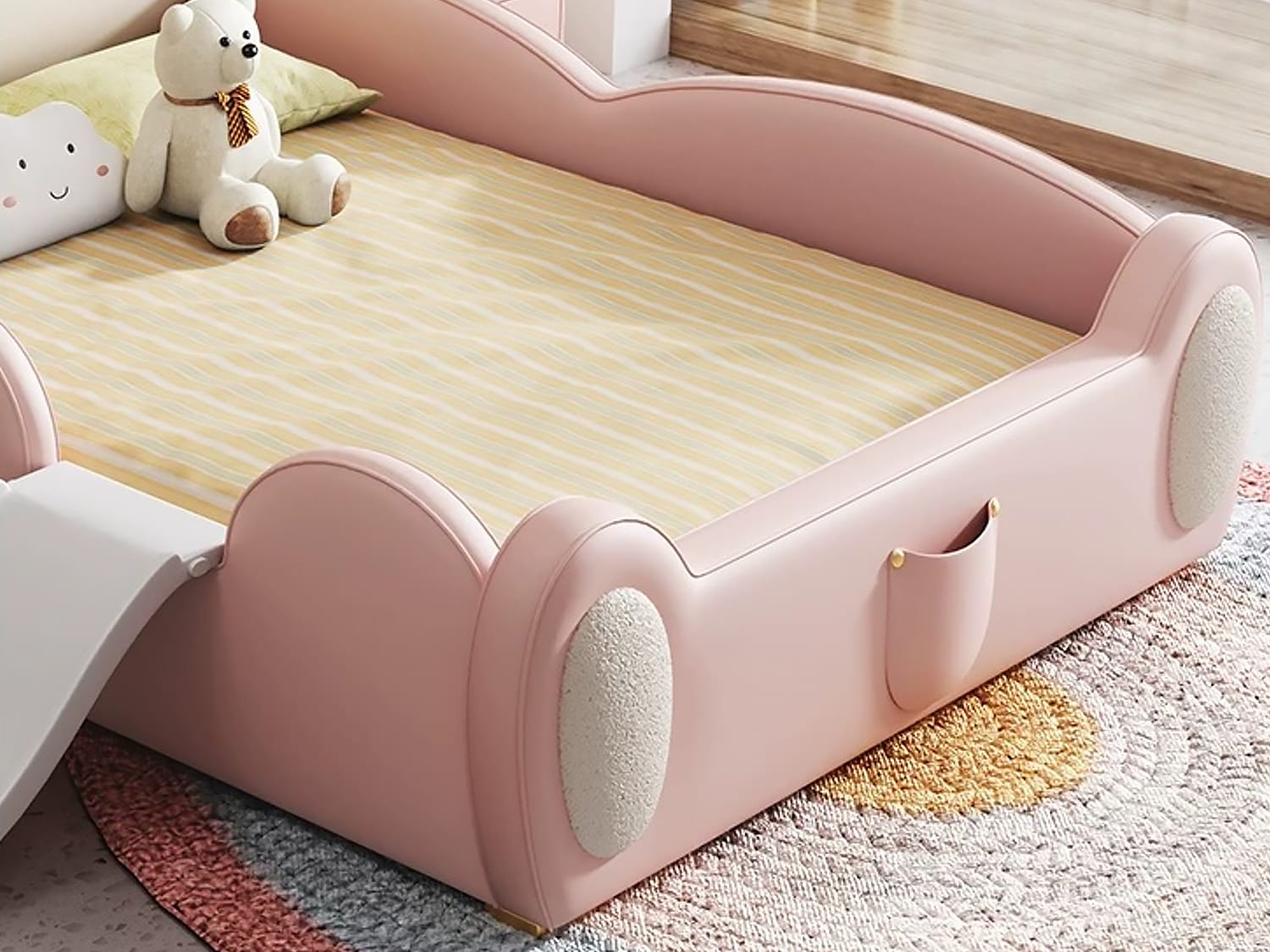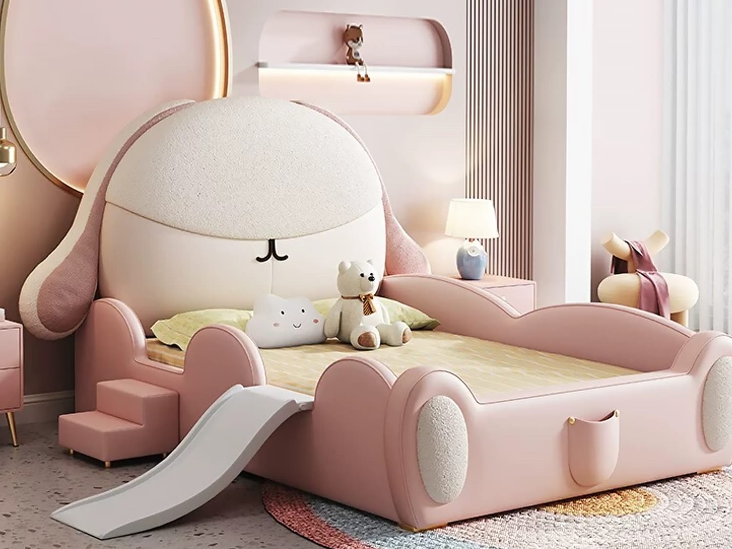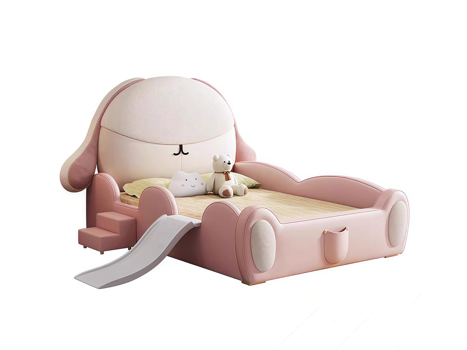 Make bedtime fun with the Vian Kid’s Bed Frame, featuring a playful and creative cartoon design that sparks imagination. This versatile bed includes a removable slide and stairs for an exciting, interactive experience. The headboard, crafted from a blend of microfiber leather and bouclé fabric, is adorned with high-density foam for plush comfort and support. Safety is a priority with rounded corners to prevent bumps and bruises. Available in Single, King Single, and Double sizes, the Vian Bed Frame combines functionality, safety, and fun in one stylish package.