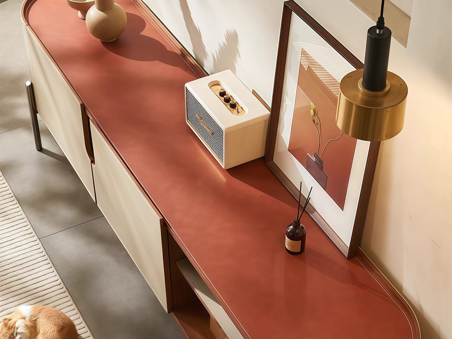 Villanueva Modern Saddle Leather TV Unit elevates your entertainment space with its rich, full-grain leather surfaces and industrial-chic metal frame. The warm saddle leather develops a unique patina over time, while the open shelving and discreet cable channels keep your media organized in style. Its asymmetrical design creates visual interest, blending rustic texture with contemporary lines. Thin stainless steel frame add structural lightness to this statement piece. Designed for connoisseurs who appreciate craftsmanship, it transforms TV viewing into a luxurious experience.