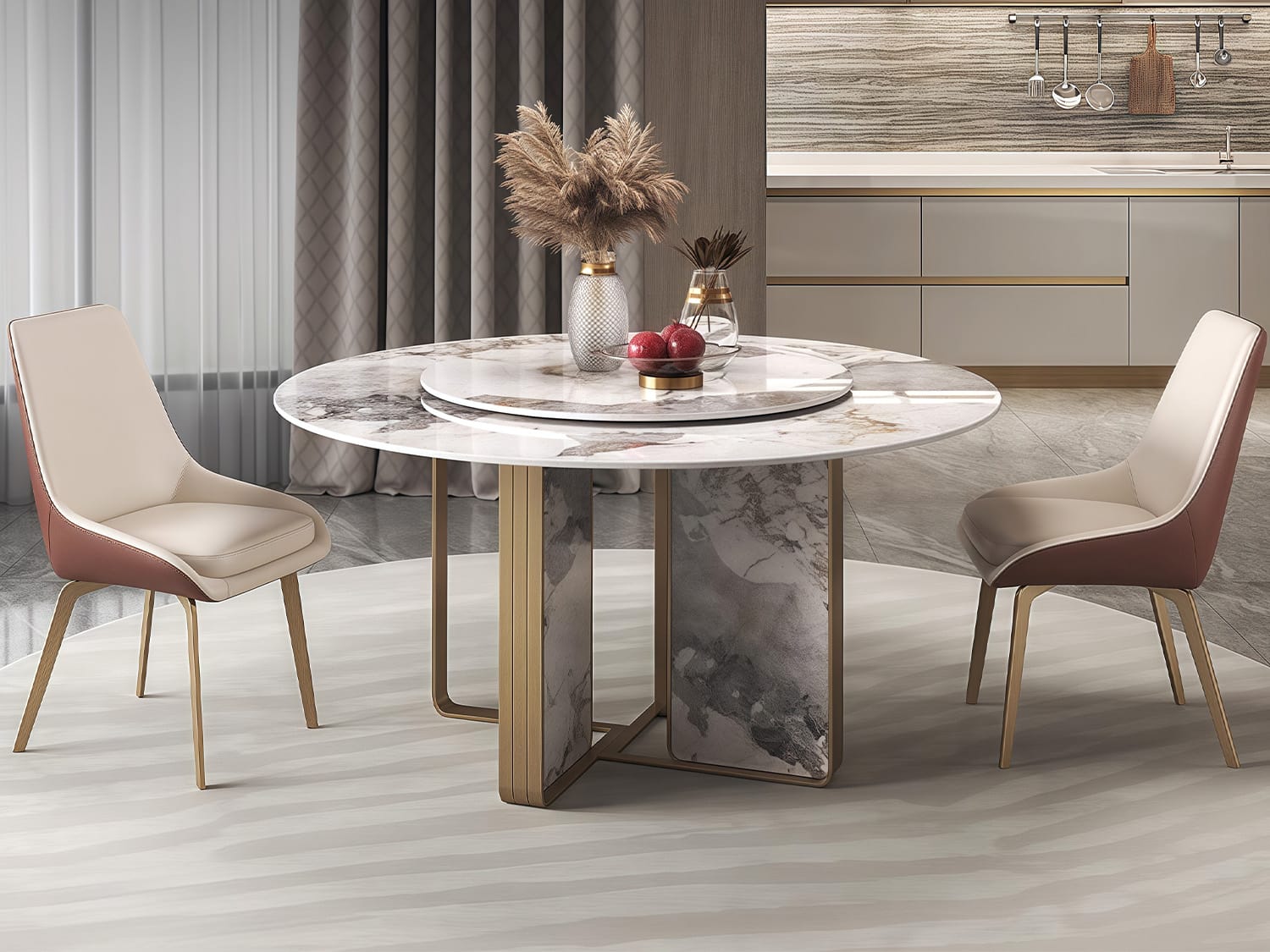 The Vina Sintered Stone Dining Table brings a refined touch to any dining space. With clean lines and versatile sizes from 120-150cm, it fits both family meals and larger gatherings. The frame is available in Gloden or Black, while the tabletop can be customized in pattern and shape to suit your style.